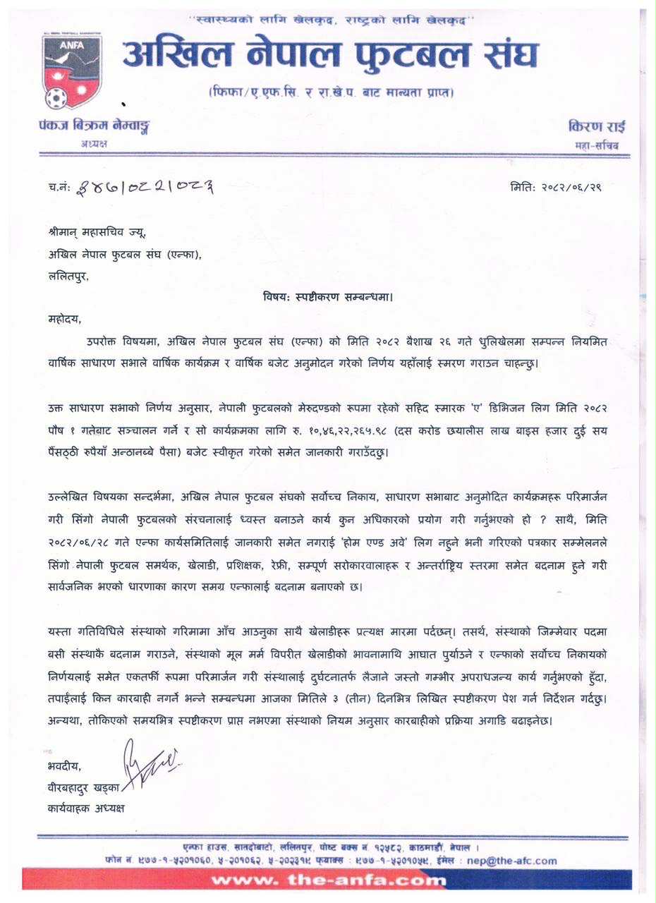 बुधबार पत्र लेख्दै खड्काले एन्फाको साधारण सभाबाट अनुमोदित भएको कार्यक्रम कार्यसमितिलाई नै जानकारी नगराई एकलौटी रुपमा पत्रकार सम्मेलन गरेर अर्को निर्णय गरेको भन्दै राईलाई स्पष्टीकरण माग्नुभएको हो ।