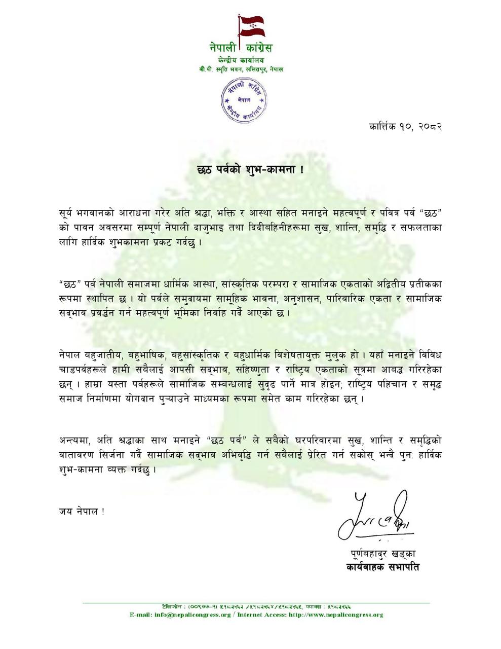 काठमाडौँ, कात्तिक १० गते । नेपाली कांग्रेसका कार्यवाहक सभापति पूर्णबहाहुर खड्काले छठ पर्व नेपाली समाजमा धार्मिक आस्था, सांस्कृतिक परम्परा र सामाजिक एकताको अद्वितीय प्रतीकका रुपमा स्थापित भएको बताउनुभयो ।
