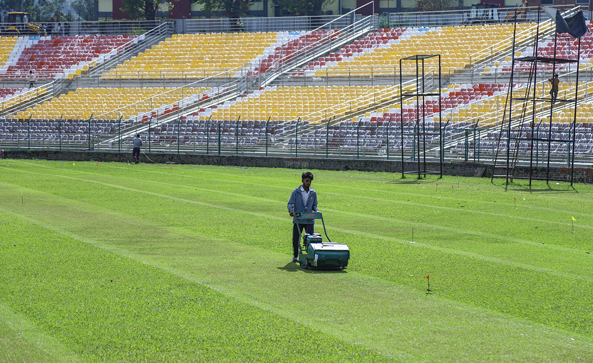 डेढ वर्षदेखि निर्माण कार्य सुरु भएको मैदान परिसरको प्यारापिटमा सिट राख्ने काम सकिएको छ । अहिले फ्लडलाइट जडान, मैदानको सरसफाइ र क्रिज पेल्ने काम धमाधम भइरहेको छ । त्यस्तै तार जाली लगाउने र पार्किङ बनाउने काम भइरहेको छ ।