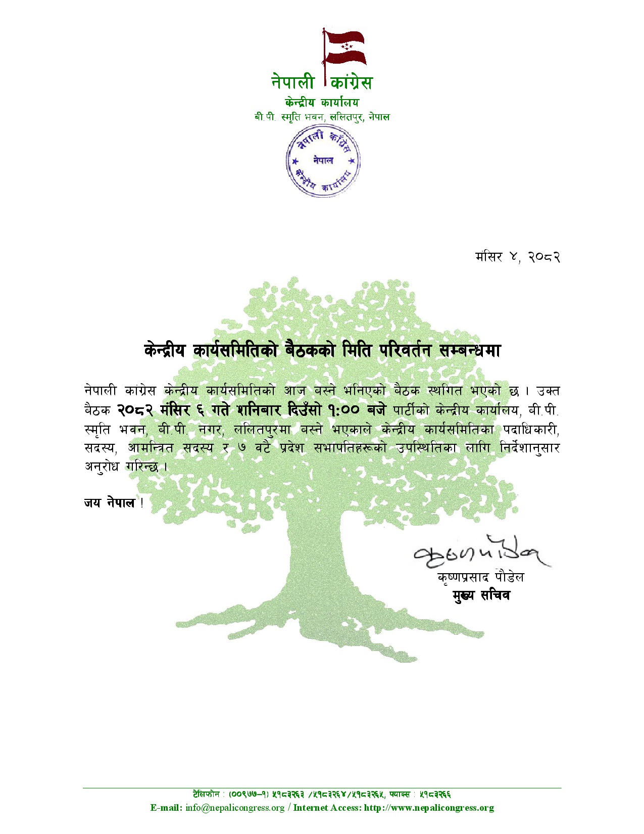 काठमाडौँ, मङ्सिर ४ गते । नेपाली कांग्रेस केन्द्रीय कार्यसमितिको बिहीबार बस्ने भनिएको बैठक स्थगित भएको छ । मुख्य सचिव कृष्णप्रसाद पौडेलले आज स्थगित बैठक यही मङ्सिर ६ गते शनिबार दिउँसो १ बजे बस्ने जानकारी दिनुभयो ।