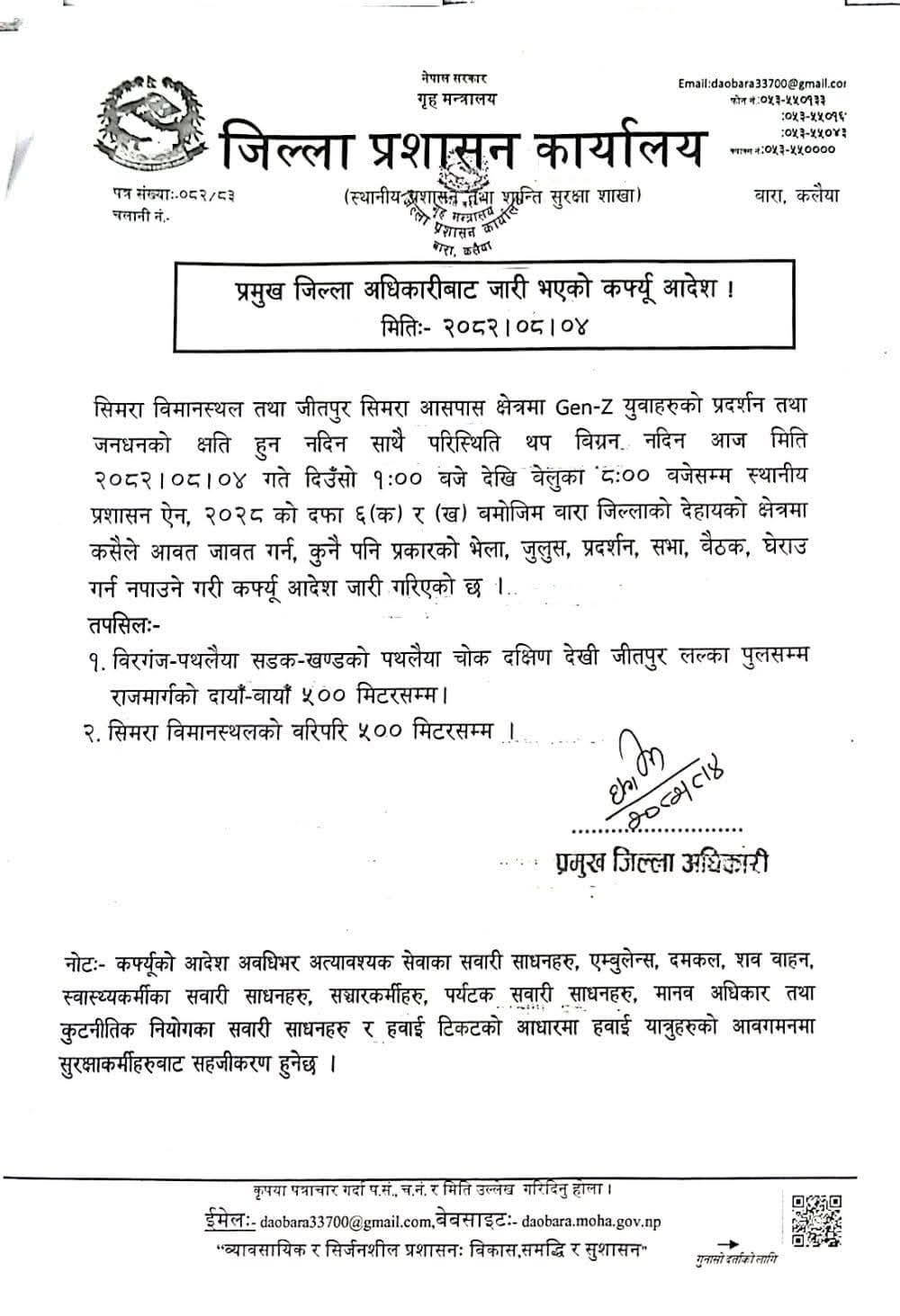 जिल्ला प्रशासन कार्यालय बाराका सहायक प्रमुख जिल्ला अधिकारी छविरमण भट्टराईका अनुसार बुधबार सिमरा चोकमा जेनजी समूहका युवाहरू र नेकपा (एमाले) का कार्यकर्ताबिच भएको झडपपछि स्थिति तनावपूर्ण बनेको थियो । सोही घटनालाई लिएर थप अशान्ति फैलिन नदिने उद्देश्यले आज पनि कर्फ्यू आदेश जारी गरिएको प्रशासनले स्पष्ट पारेको उहाँले बताउनुभयो।