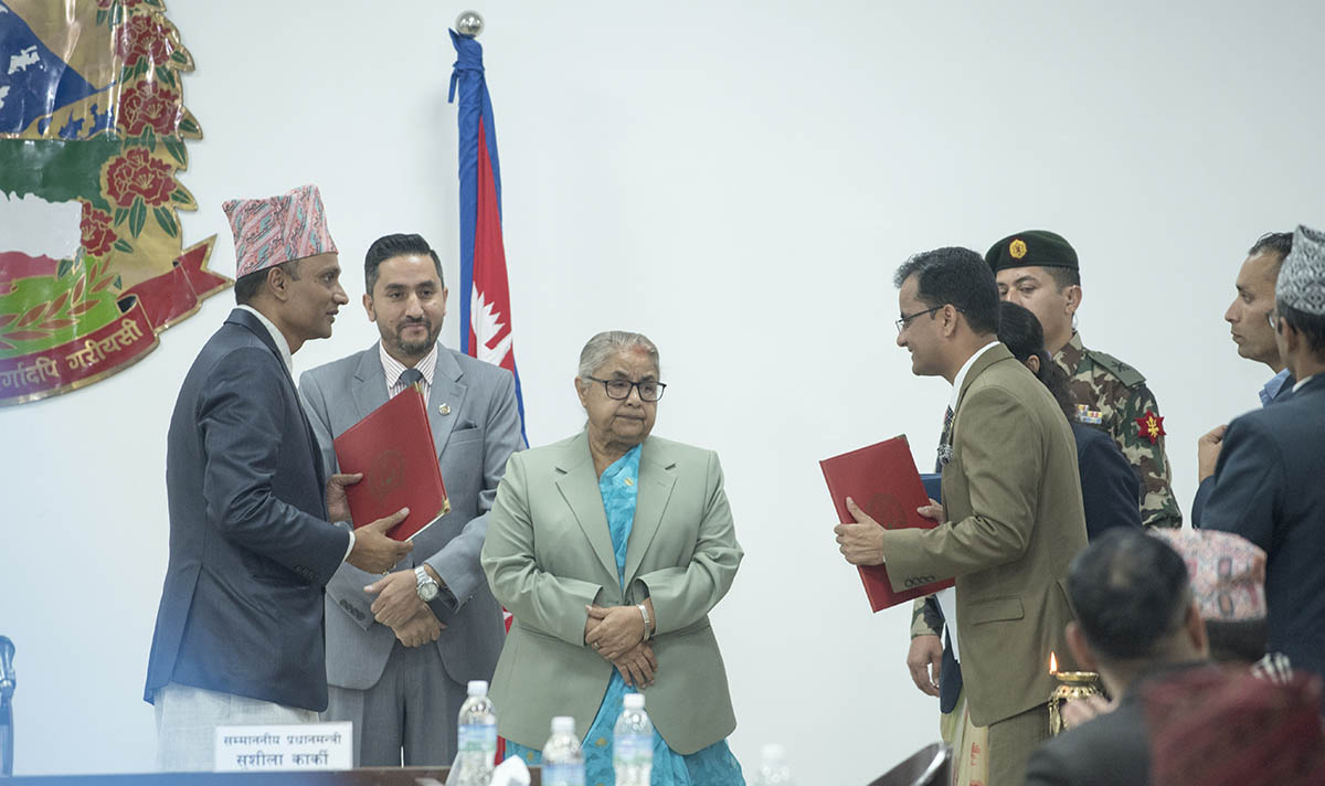 प्रधानमन्त्री सुशीला कार्की र सञ्चार तथा सूचना प्रविधिमन्त्री जगदीश खरेलको उपस्थितिमा गोरखापत्र संस्थानका महाप्रबन्धक लालबहादुर ऐरी र सामाजिक सुरक्षा कोषका कार्यकारी निर्देशक कविराज अधिकारी समझदारी पत्र आदानप्रदान गर्दै । तस्बिर : सागर बस्नेत