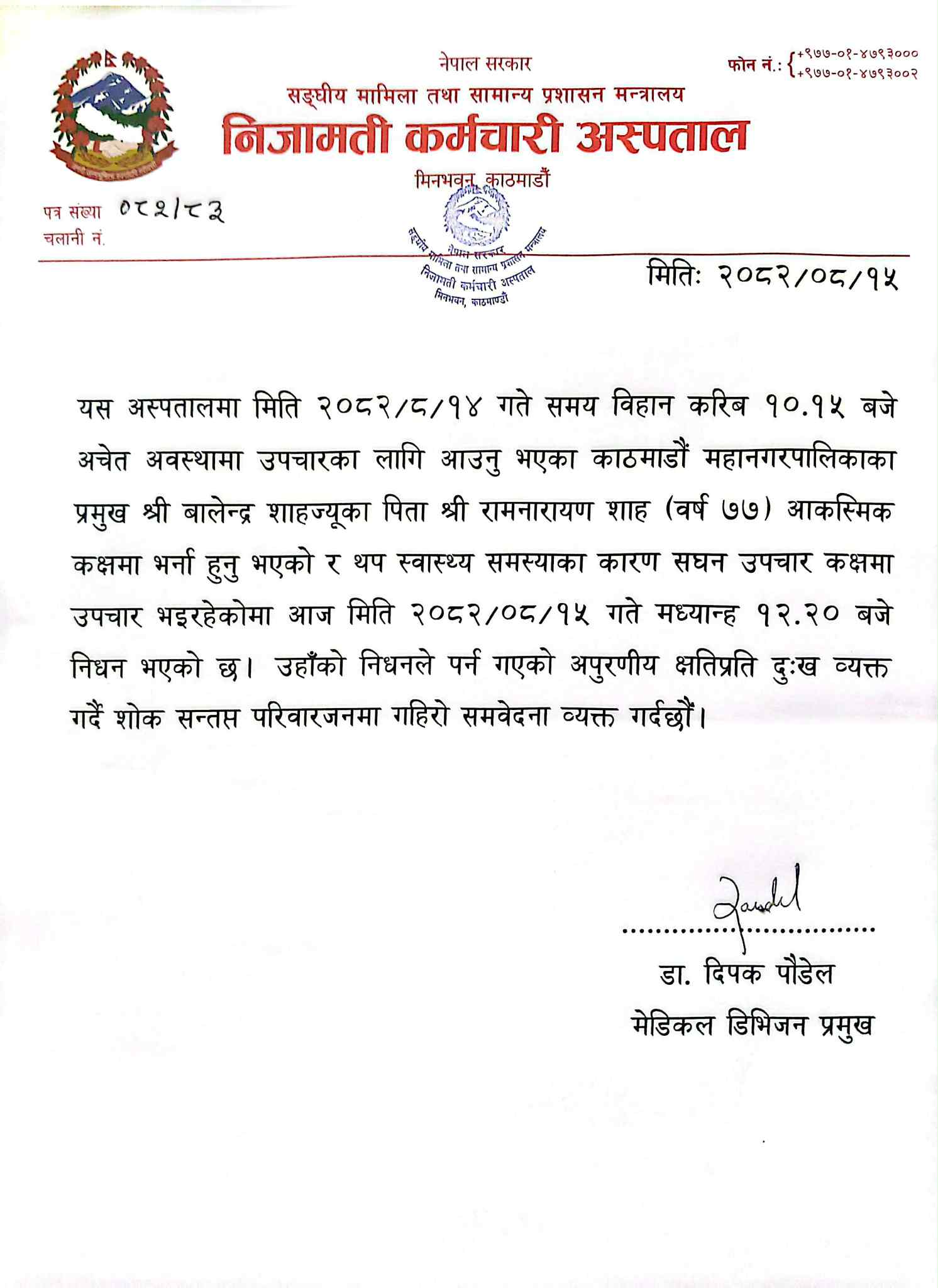 काठमाडौं, मङ्सिर १५ गते । काठमाडौं महानगरपालिकाका प्रमुख बालेन्द्र साहलाई पितृशोक परेको छ । उहाँका पिता आयुर्वेदिक चिकित्सक डा. रामनारायण साहको उपचारका क्रममा आज आज दिउँसो १२ः२० बजे नयाँ बानेश्वरस्थित सिभिल अस्पतालमा निधन भएको अस्पतालका निर्देशक मोहनचन्द्र रेग्मीले जानकारी दिनुभयो ।