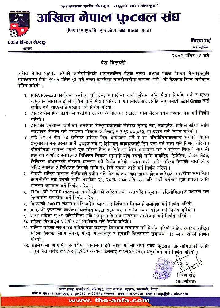सातदोबाटोस्थित एन्फा कम्प्लेक्समा बसेको बैठकले राष्ट्रिय लिग सम्पन्न भएको एक महिनापछि शीर्ष डिभिजनको शहिद स्मारक ‘ए’ डिभिजन लिग गर्ने निर्णय गरेको हो ।