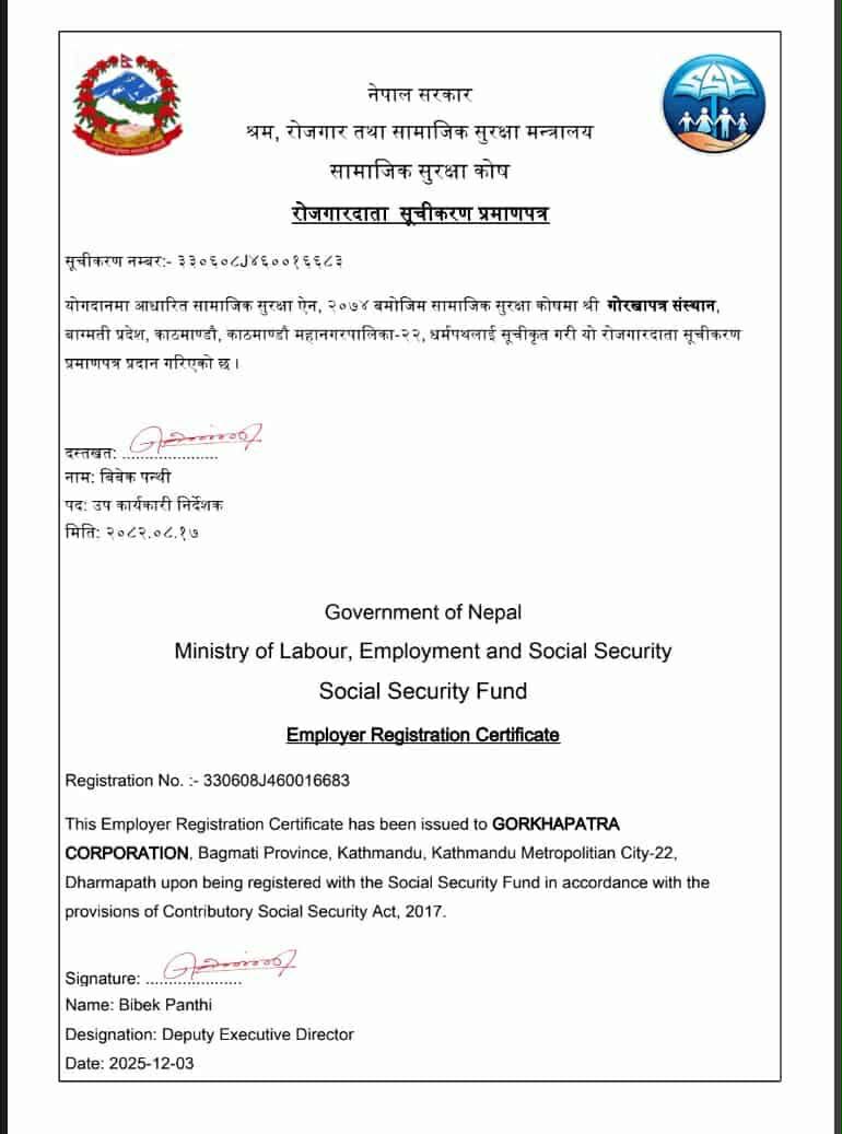 कोषका उप कार्यकारी निर्देशक बिवेक पन्थीले योगदानमा आधारित सामाजिक सुरक्षा ऐन, २०७४ बमोजिम सामाजिक सुरक्षा कोषमा गोरखापत्र संस्थानलाई सूचीकृत गरी रोजगारदाता सूचीकरण प्रमाणपत्र प्रदान गरिएको जानकारी दिनुभयो ।