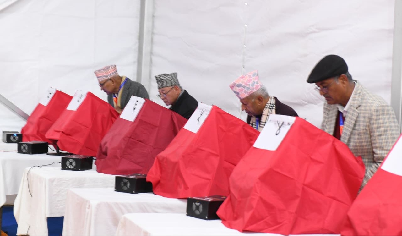 काठमाडौँ, पुस २ गते । नेकपा (एमाले) को ११ औँ राष्ट्रिय महाधिवेशनको पाँचौँ दिन आज बिहानदेखि मतदान सुरु भएको छ । अध्यक्ष पदका प्रत्याशीहरू केपी शर्मा ओली र ईश्वर पोखरेलले विद्युतीय भोटिङ मेसिनमा बिहानै मतदान गर्नुभएपछि बिहान ९ बजेदेखि मतदान प्रक्रिया सुरु भएको हो ।