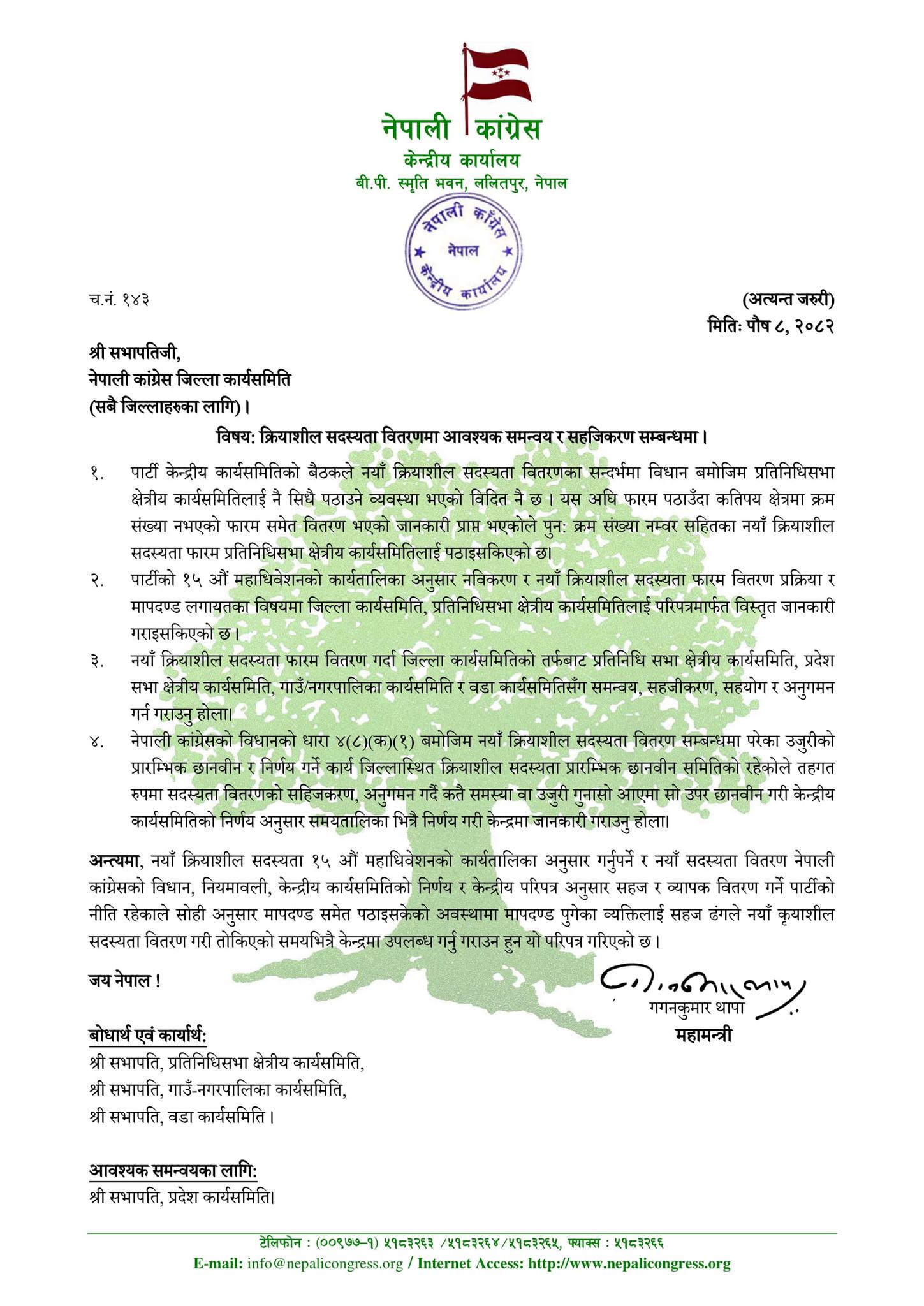 महामन्त्री थापाले सबै जिल्ला कार्यसमितिका सभापतिलाई सम्बोधन गर्नुहुँदै पुनः क्रम सङ्ख्या नम्बरसहितका नयाँ क्रियाशील सदस्यता फारम प्रतिनिधिसभा क्षेत्रीय कार्यसमितिलाई पठाइएको जानकारी दिनु भएको छ।