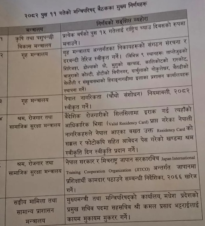 त्यसैगरी, सरकारले नेपाल तागरिकता (चौथो संशोधन) नियमावली २०८२ स्वीकृत गर्ने निर्णय गरेको छ।