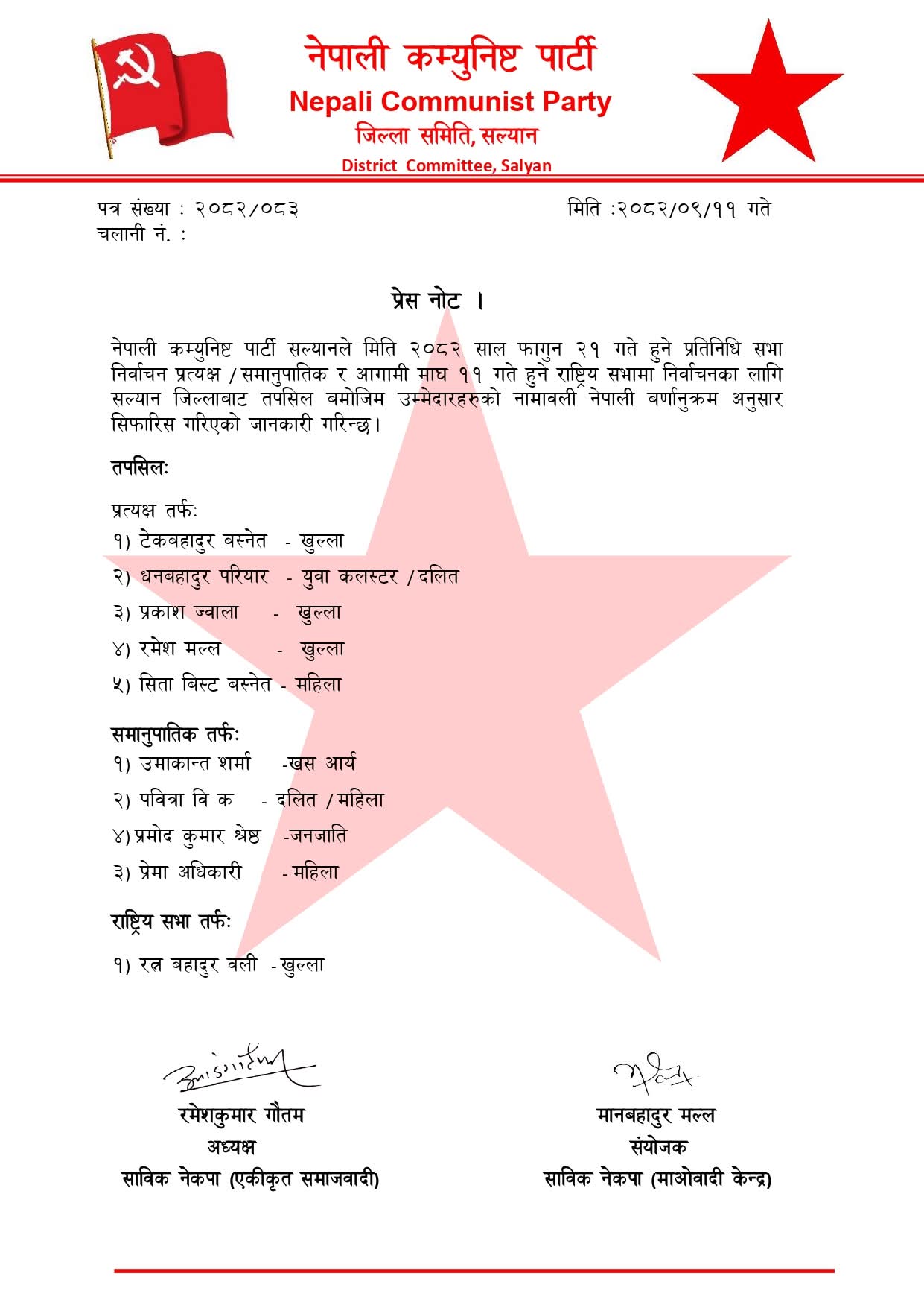 युवा नेता तथा साबिक एकीकृत समाजवादी सल्यानका जिल्ला अध्यक्ष रमेशकुमार गौतमले प्रत्यक्षतर्फ दलित कोटाबाट धनबहादुर परियार र महिला कोटाबाट सीता विष्ट बस्नेतलाई सिफारिस गरिएको जानकारी दिनुभयो ।