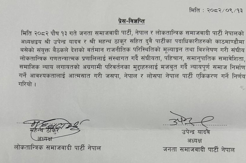 काठमाडौं, पुस १३ गते । जनता समाजवादी पार्टी, नेपाल (जसपा नेपाल) र लोकतान्त्रिक समाजवादी पार्टी, नेपाल (लोसपा नेपाल) बिच एकीकरण गर्ने निर्णय भएको छ । दुवै पार्टीका अध्यक्ष उपेन्द्र यादव र महन्थ ठाकुरसहित पदाधिकारीहरूको काठमाडौंमा बसेको संयुक्त बैठकले पार्टी एकीकरण गर्ने निर्णय गरेको हो ।