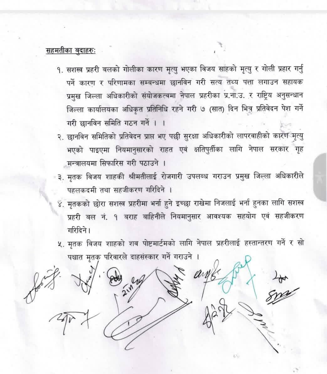 बुधबार राति गोली हान्ने सशस्त्र प्रहरीलाई कारबाहीको माग गर्दै स्थानीयले सडकमा साहको शव राखेर प्रदर्शन गरेपछि बसेको सर्वपक्षीय बैठकले पाँच बुँदे सहमति गरेको हो ।