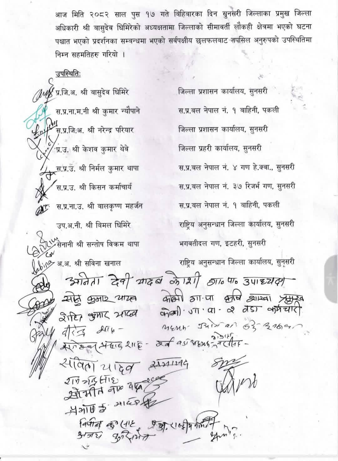 सहमति अनुसार घटनाको निष्पक्ष छानबिन गरी दोषी उपर कारबाही गर्ने उल्लेख छ । मृतककी श्रीमती र छोरालाई जागिर लगाउने र काजक्रिया एवम् क्षतिपूर्ति बापत सहयोग उपलब्ध गराइने छ ।