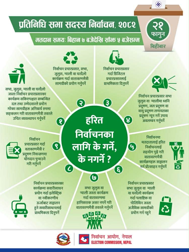 निर्वाचनलाई प्रदूषणमुक्त र हरित विकासमैत्री बनाउनका लागि आयोगले सबै राजनीतिक दल तथा उम्मेदवारलाई वातावरणमैत्री विधिको अवलम्बन गर्दै सूचना तथा जानकारी दिन आइतबारदेखि नै सुरु गरेको छ ।