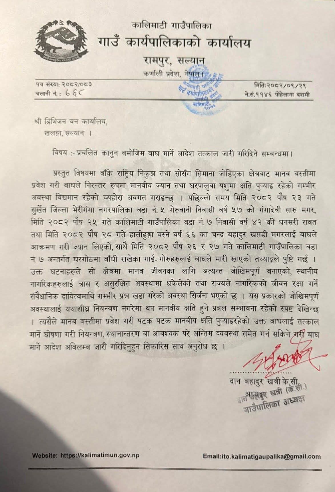 सल्यान, पुस ३० गते । सल्यानको कालीमाटी गाउँपालिकाले बाघ मार्ने आदेश मागेको छ । गाउँपालिकाभित्र बाघ मानव बस्तीमा प्रवेश गरी मानिसको ज्यान लिने, घरपालुवा पशु मार्ने तथा स्थानीयलाई असुरक्षित बनाएको भन्दै गाउँपालिकाले डिभिजन वन कार्यालय सल्यानलाई बाघ मार्ने आदेश जारी गर्न पत्राचार गरेको हो ।