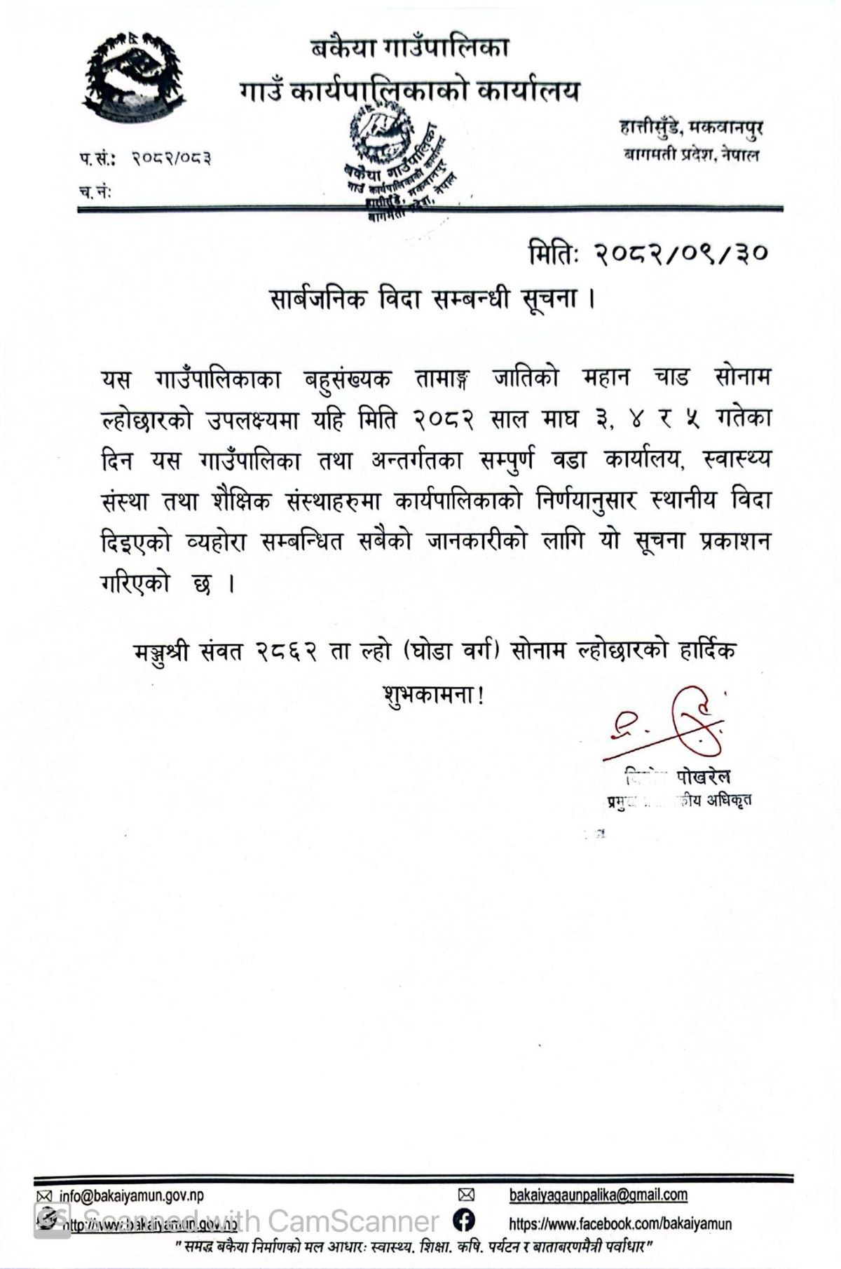 पालिकाका प्रमुख प्रशासकीय अधिकृत बिनोद पोखरेलले हस्ताक्षर गर्नुभएको सूचनामा मञ्जुश्री संवत २८६२ ता ल्हो (घोडा वर्ग) सोनाम ल्होछारको शुभकामना समेत व्यक्त गरिएको छ ।