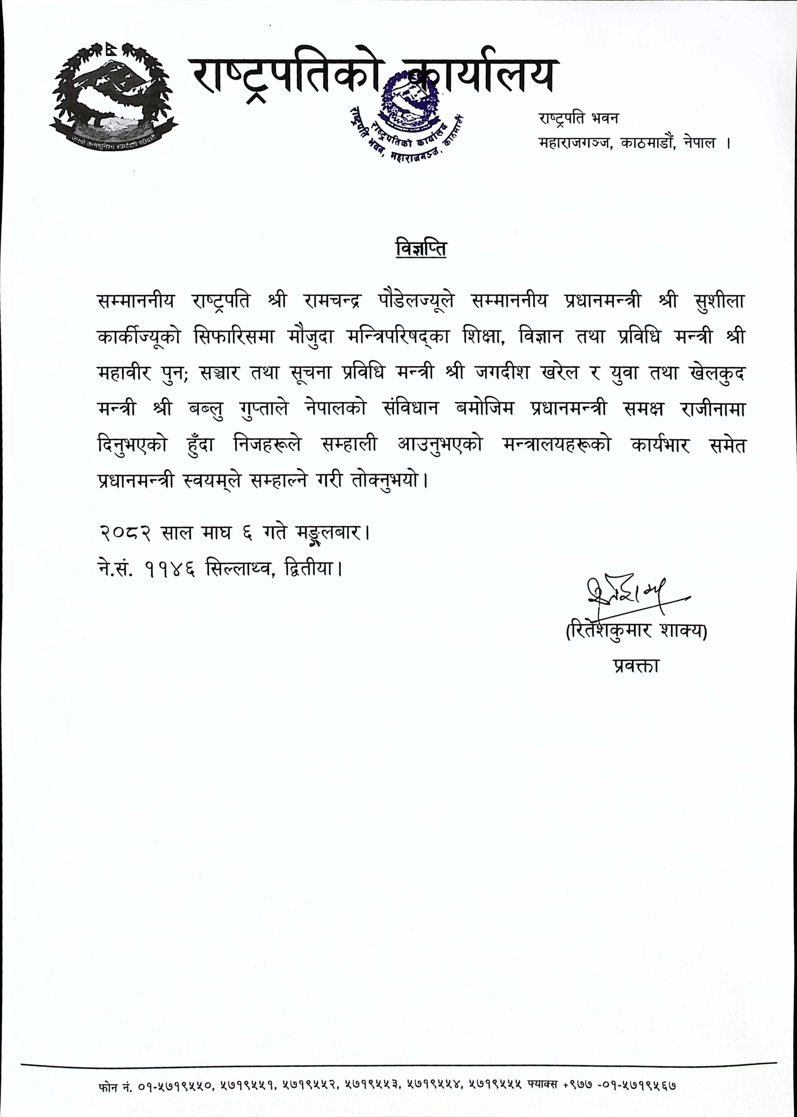 प्रधानमन्त्रीसमक्ष शिक्षा, विज्ञान तथा प्रविधिमन्त्री महावीर पुन, सञ्चार तथा सूचना प्रविधिमन्त्री जगदीश खरेल र युवा तथा खेलकुदमन्त्री बब्लु गुप्ताले पदबाट राजीनामा दिनुभएकाले उहाँहरुले सम्हाली आउनुभएका मन्त्रालयको कार्यभार प्रधानमन्त्री कार्कीले नै सम्हाल्ने गरी तोक्नुभएको राष्ट्रपतिको कार्यालयले जनाएको छ ।