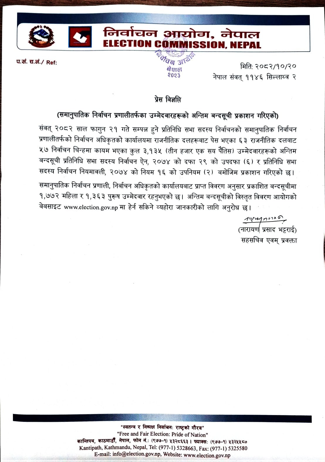निर्वाचन अधिकृतको कार्यालयबाट प्राप्त विवरण अनुसार प्रकाशित बन्दसूचीमा एक हजार सात सय ७२ महिला र एक हजार ३६३ पुरुष उम्मेदवार रहनुभएको छ । अन्तिम बन्दसूचीको विस्तृत विवरण आयोगको वेबसाइटमा राखिएको आयोगले जनाएको छ ।