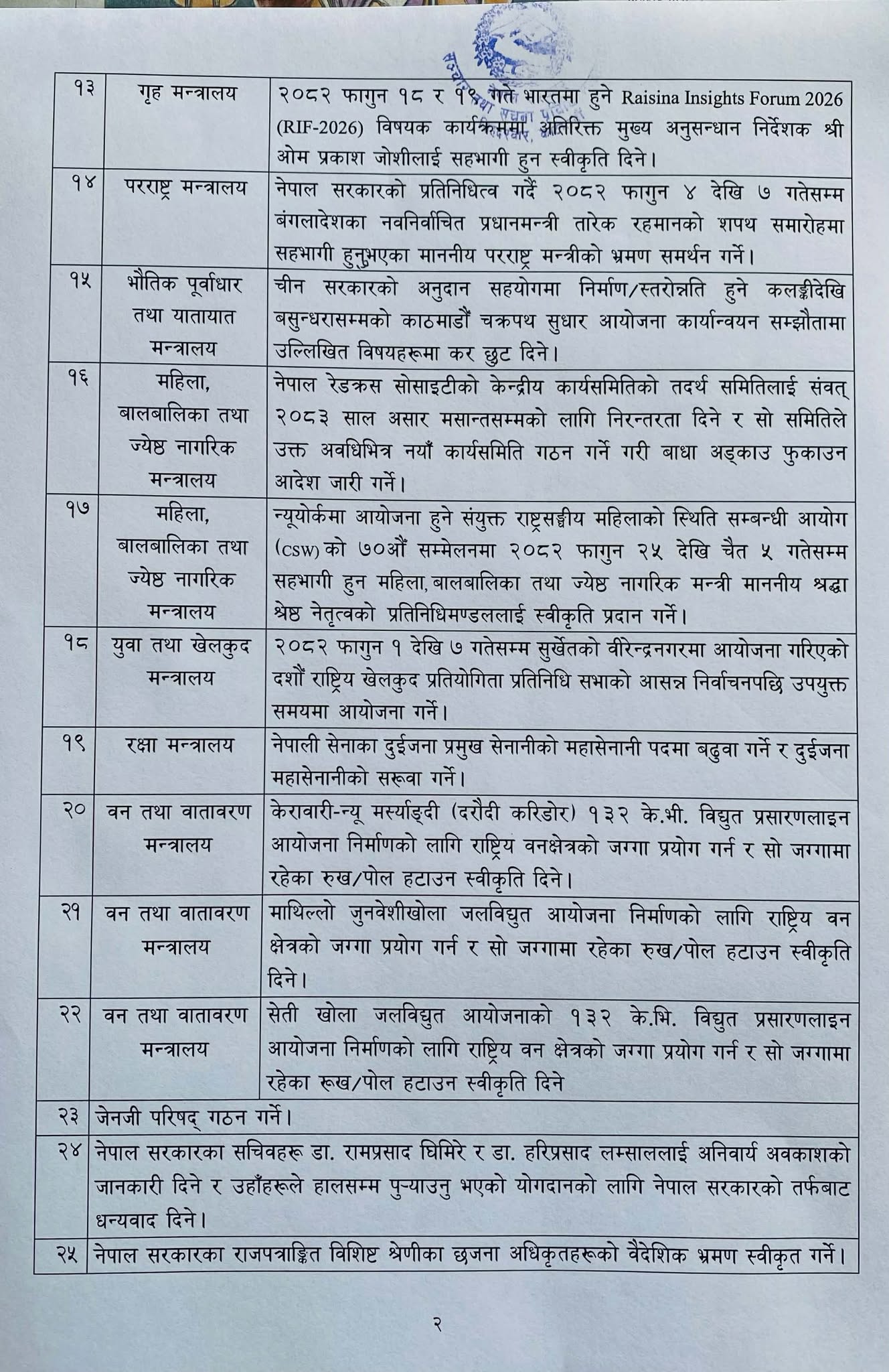 प्रवक्ता अर्यालले बैठकले 'जेनजी परिषद्' गठन गर्ने र नेपाल सरकारका सचिवद्वय डा. रामप्रसाद घिमिरे र डा. हरिप्रसाद लम्साललाई अनिवार्य अवकाशको जानकारी दिँदै धन्यवाद दिने निर्णय गरेको जानकारी दिनुभयो ।