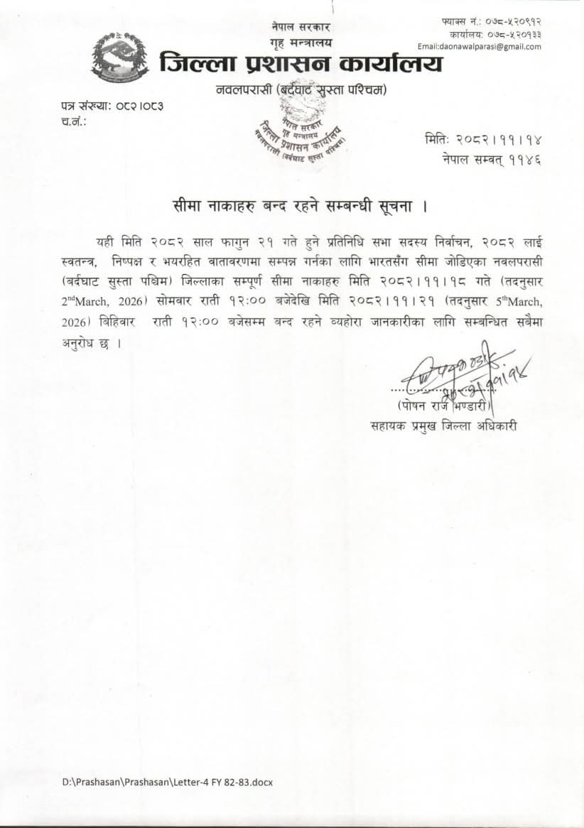 भारतसँग जोडिएका नवलपरासी (बर्दघाट सुस्ता पश्चिम) जिल्लाका सम्पूर्ण सीमा नाकाहरू बन्द हुने छ । जिल्ला प्रशासन कार्यालयका सहायक प्रमुख जिल्ला अधिकारी पोषण राज भण्डारीका अनुसार निर्वाचनको सुरक्षा संवेदनशीलतालाई ध्यानमा राख्दै सो अवधिभर सीमाबाट हुने आवतजावत पूर्ण रूपमा बन्द रहनेछ।