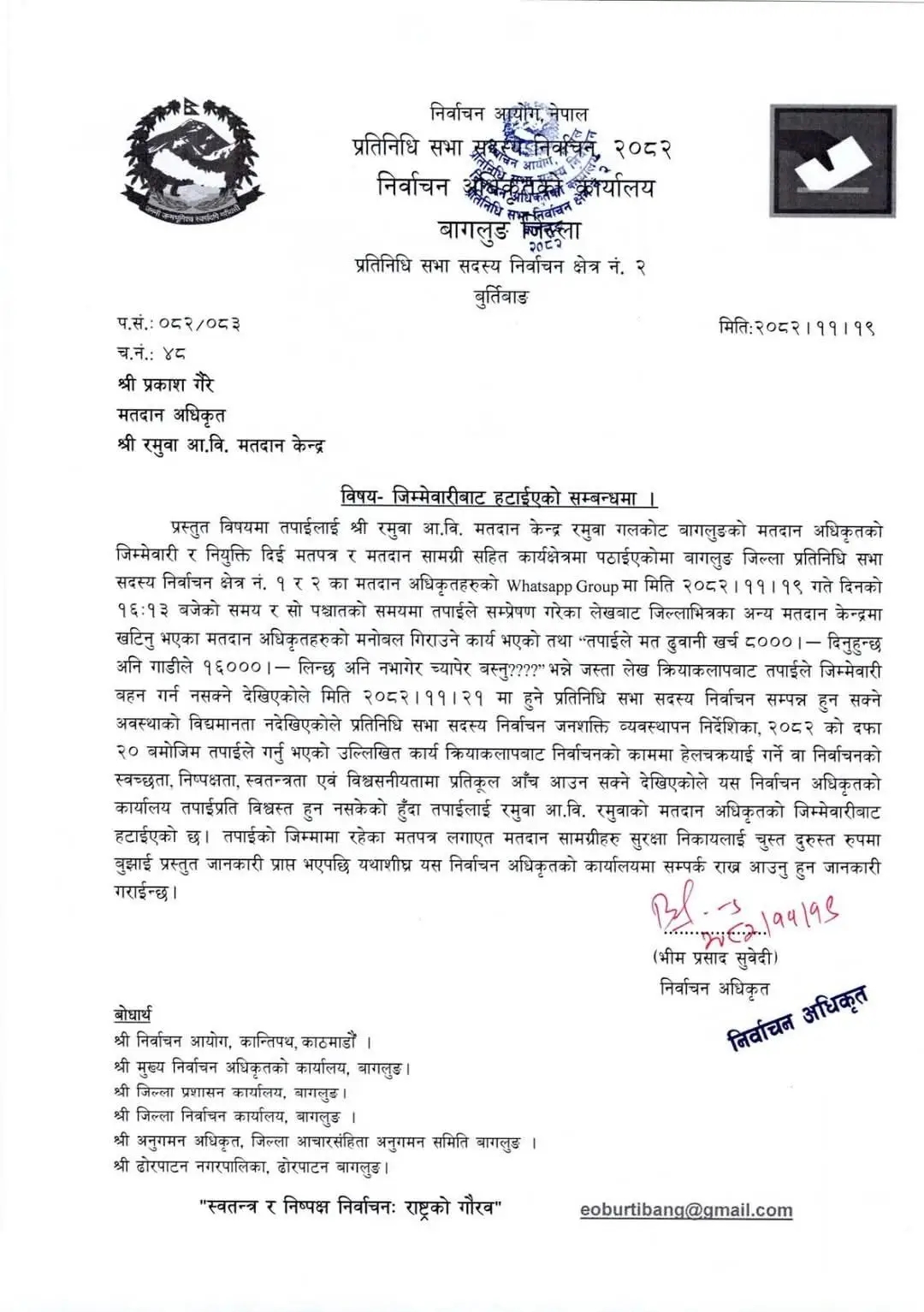 मतदान अधिकृतहरूको व्हाट्सएप समूहमा उहाँले लेखेका केही अभिव्यक्ति तथा गतिविधिले निर्वाचनको स्वच्छता, निष्पक्षता र विश्वसनीयतामा नकारात्मक प्रभाव पर्न सक्ने देखिएको बागलुङ क्षेत्र नम्बर २ का निर्वाचन अधिकृत भीमप्रसाद सुवेदीले जानकारी दिनुभयो । मतदान अधिकृतले गर्न नहुने किसिमका गतिविधि गरेको देखिएकाले जिम्मेवारीबाट हटाइएको उल्लेख गरिएको छ ।