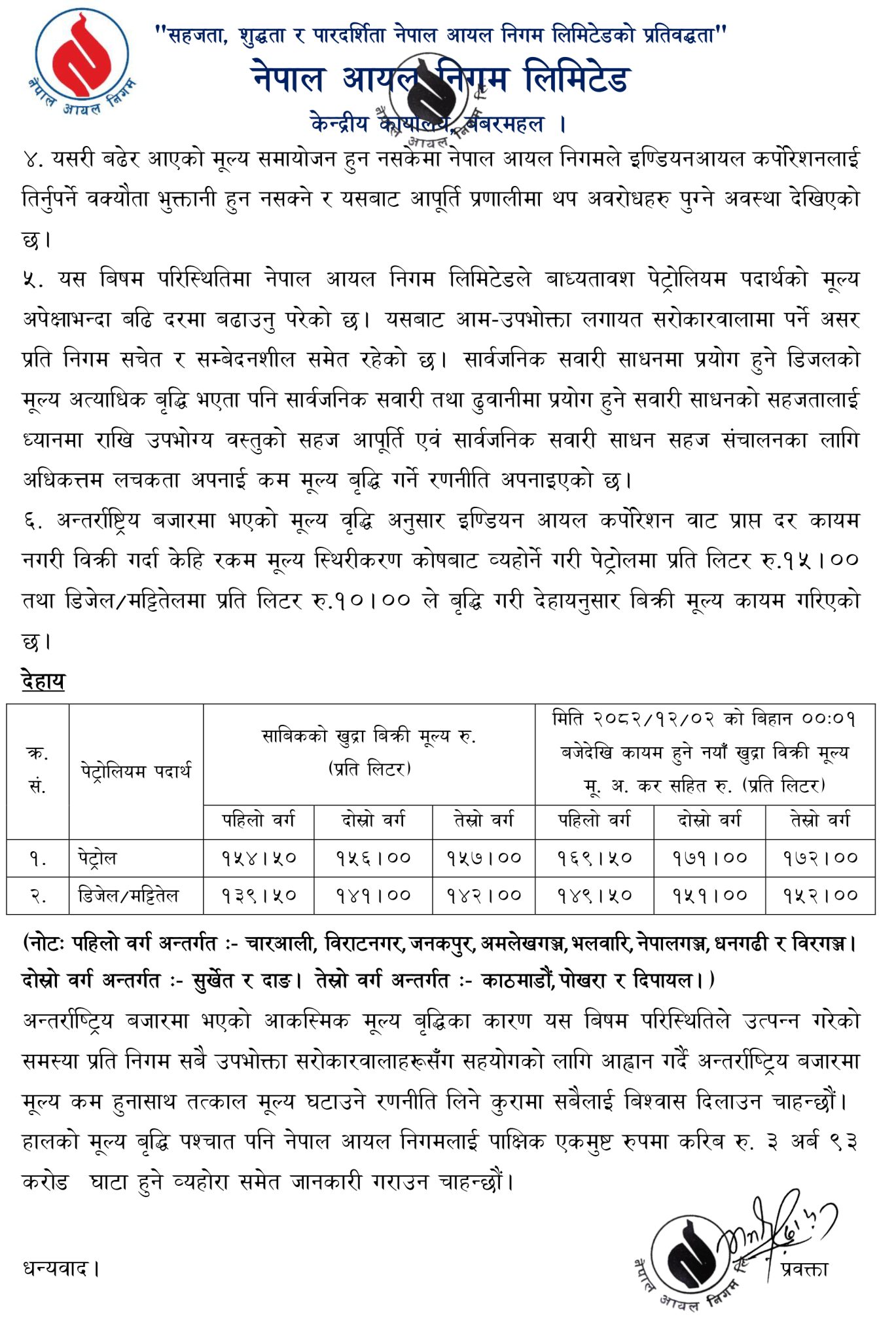 निगमका अनुसार नयाँ मूल्य आजै रातिदेखि लागू हुनेगरी समायोजन गरिएको छ । अन्तर्राष्ट्रिय बजारमा पेट्रोलमा प्रतिलिटर ३१ रुपियाँ, डिजेलमा प्रतिलिटर ५४ रुपियाँ तथा खाना पकाउने एलपि ग्यासमा २१६ रुपियाँ वृद्धि गरिएको छ। तर नेपालमा केही रुपियाँ स्थिरीकरण कोषबाट व्यहोरिने गरी पेट्रोलमा प्रतिलिटर १५ रुपियाँ र डिजेल, मट्टितेलमा प्रतिलिटर १० रुपियाँ बृद्धि गरिएको निगमले जनाएको छ ।