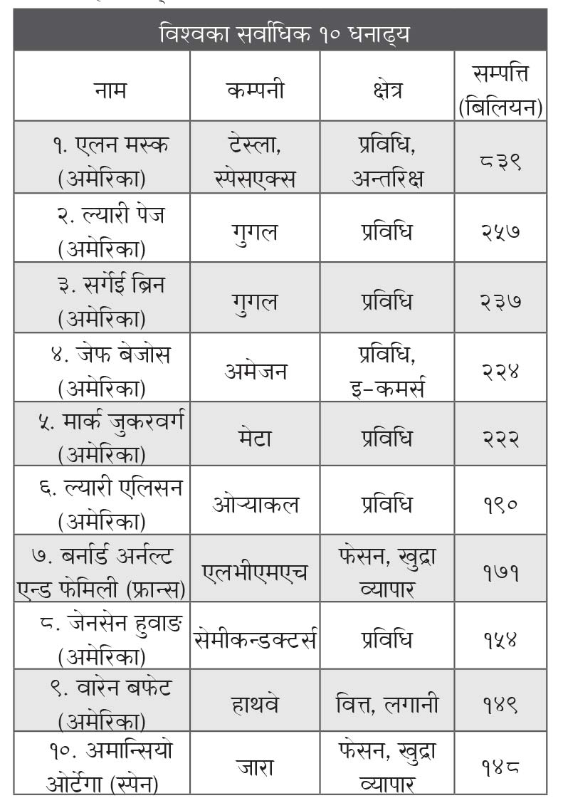 – नवप्रवर्तन र प्रविधिको नेतृत्व गरिरहेका टेस्ला र स्पेसएक्सका मालिक एलन मस्कको सम्पत्ति हाल ८३९ अर्ब डलर रहेको छ ।