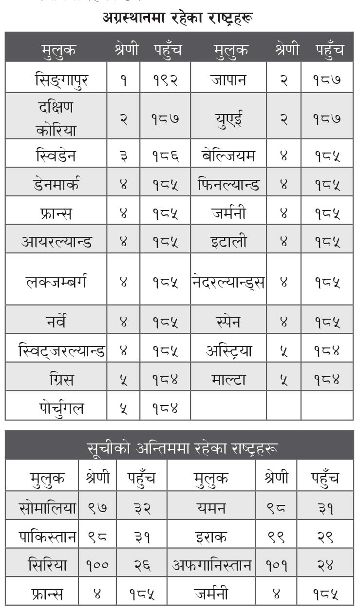 – हेन्ली पासपोर्ट इन्डेक्स २०२६ अनुसार पहिलो स्थानमा सिङ्गापुर (१९२ गन्तव्य) रहेको छ ।
