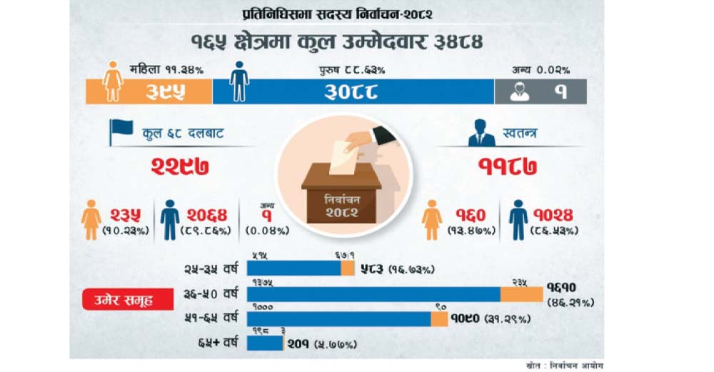 प्रतिनिधि सभामा २७५ जना सदस्य रहने संविधानले व्यवस्था गरेको छ । जसमध्ये प्रत्यक्षबाट १६५ र समानुपातिकबाट ११० जना सदस्य निर्वाचित हुन्छ । दुवै विधिबाट चयन हुने सदस्यको भूमिका र जिम्मेवारी बराबर हुन्छ । प्रतिनिधि सभाको प्रत्यक्षतर्फको निर्वाचनमा तीन हजार ४८४ जना उम्मेदवार छन् । प्रत्यक्षतर्फ ६८ दलले भाग लिँदै छन् । समानुपातिकतर्फको निर्वाचनमा तीन हजार ४२४ जना उम्मेदवार छन् । समानुपातिकतर्फ ६४ दलले भाग लिँदै छन् । समानुपातिकतर्फ ५४ वटा दलले आआफ्नो निर्वाचन चिह्नमा र १० वटा दलले चार वटा निर्वाचन चिह्न (एकल) प्रयोग गर्ने छन् । दुवै निर्वाचन एकै दिन हुने छ । मतपत्र मात्र फरक हुने छ ।