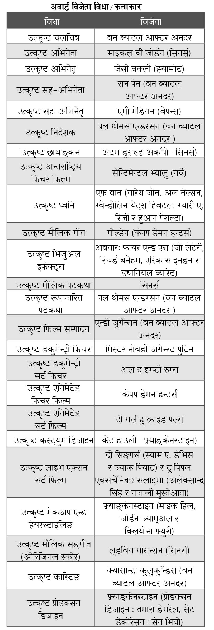 यस संस्करणमा ‘वन ब्याटल आफ्टर अनदर’ ले सबैभन्दा धेरै छ वटा विधामा अवार्ड जित्न सफल भएको छ ।