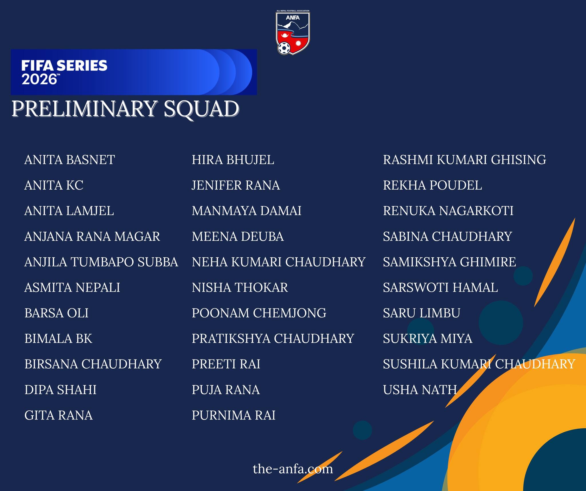 काठमाडौँ, चैत ११ गते । नेपाली महिला राष्ट्रिय फुटबल टोलीले फिफा सिरिज–२०२६ अन्तर्गत थाइल्यान्डमा खेल्ने अन्तर्राष्ट्रिय मैत्रीपूर्ण सिरिजका लागि अखिल नेपाल फुटबल सङ्घ (एन्फा)ले बुधबार ३२ सदस्यीय प्रारम्भिक खेलाडी टोलीको घोषणा गरेको छ ।