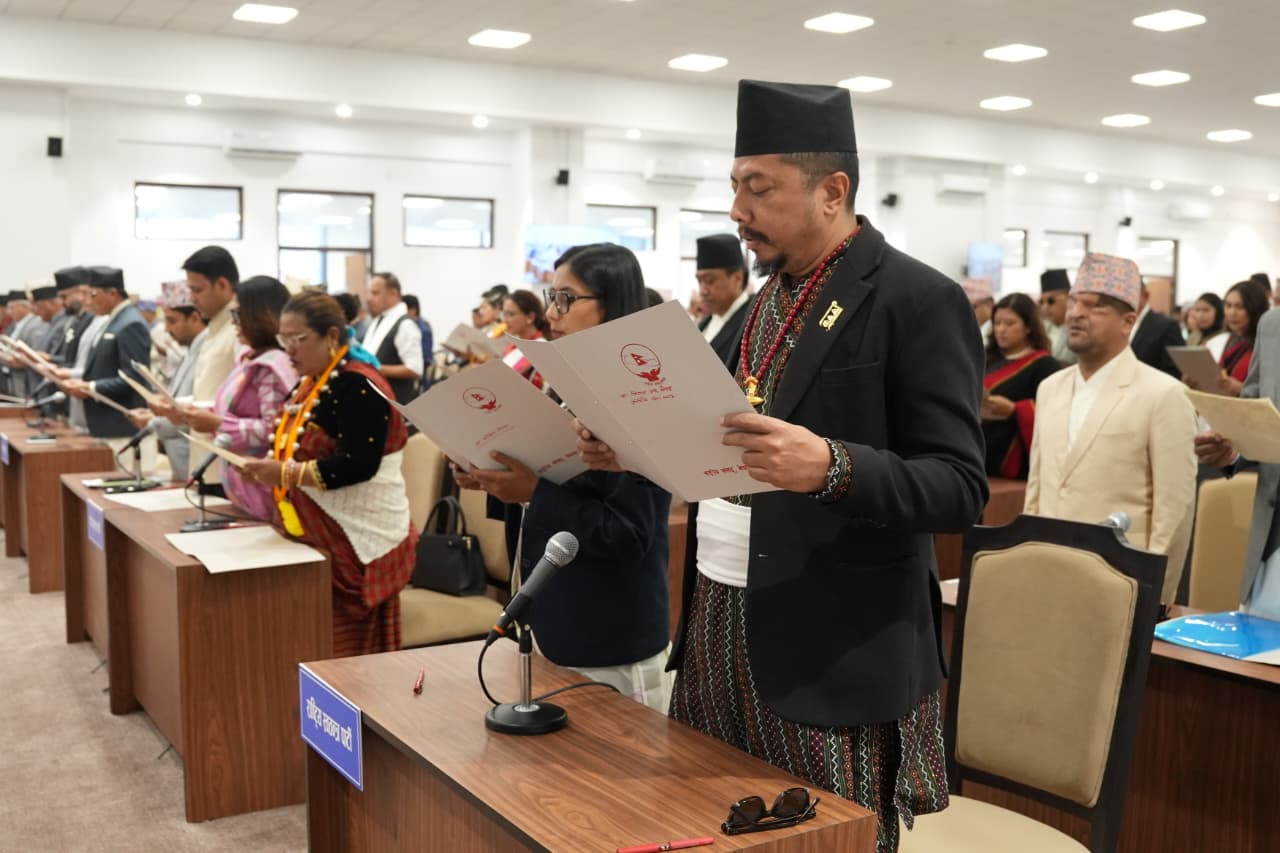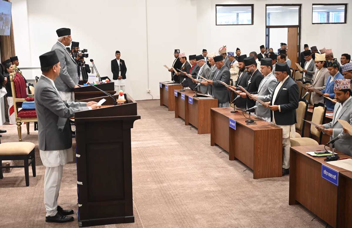 सिंहदरबारस्थित सङ्घीय संसद् सचिवालयको नवनिर्मित बहुउद्देश्यीय हलमा आयोजित समारोहमा प्रतिनिधिसभाका ज्येष्ठ सदस्य अर्जुननरसिंह केसीले उहाँहरुलाई पद तथा गोपनीयताको शपथ गराउनुभएको हो ।