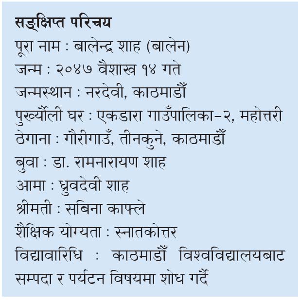 काठमाडौँ, चैत १४ गते । नवनियुक्त प्रधानमन्त्री बालेन्द्र शाह (बालेन) को पहिचान २०७८ सालभन्दा अघि जागरणका गीतसँगै सुधारका पक्षमा निरन्तर खबरदारी गर्ने गायक एवं अभियन्ताका रूपमा थियो । २०७९ सालको स्थानीय तह निर्वाचनले उहाँको पहिचान फेरिदियो । स्थानीय तहको निर्वाचनमा उहाँ काठमाडौँ महानगरपालिका प्रमुखमा निर्वाचित हुनुभयो ।