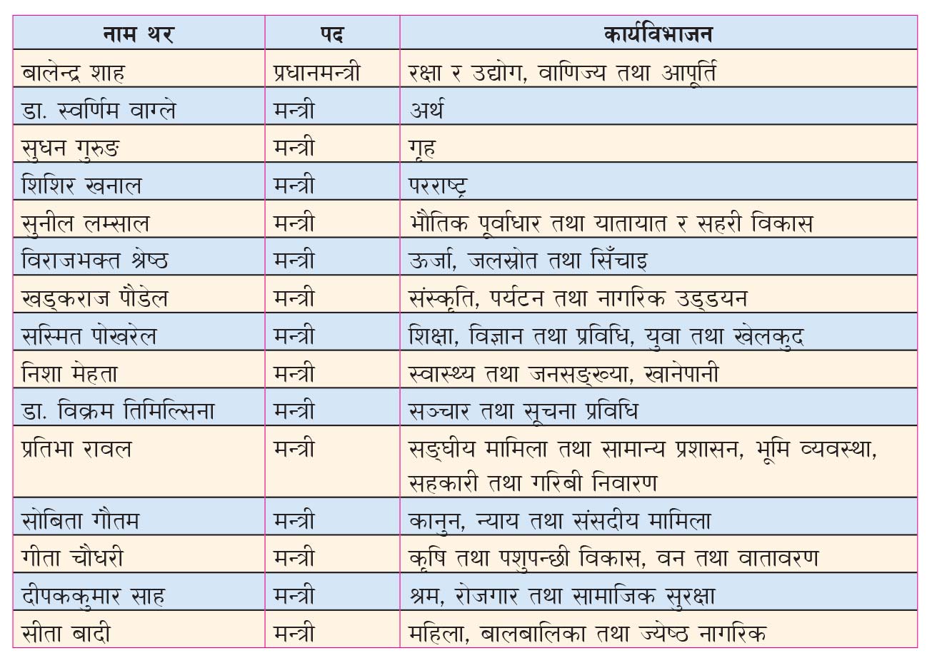 प्रधानमन्त्रीको शपथग्रहणलगत्तै राष्ट्रपति पौडेलले संविधानको धारा ७६ (९) बमोजिम मन्त्रीपरिषद्का सदस्यहरूको कार्यविभाजन गर्नुभयो । त्यसअघि राष्ट्रपति पौडेलले संविधानको धारा ८० बमोजिम मन्त्रीलाई शपथग्रहण गराउनुभयो । राष्ट्रपतिले प्रधानमन्त्रीको सिफारिसमा सङ्घीय संसद्का सदस्यमध्येबाट समावेशी सिद्धान्तबमोजिम प्रधानमन्त्रीसहित बढीमा २५ जना मन्त्री रहेको मन्त्रीपरिषद् गठन गर्ने धारा ७६ (९) मा उल्लेख छ ।