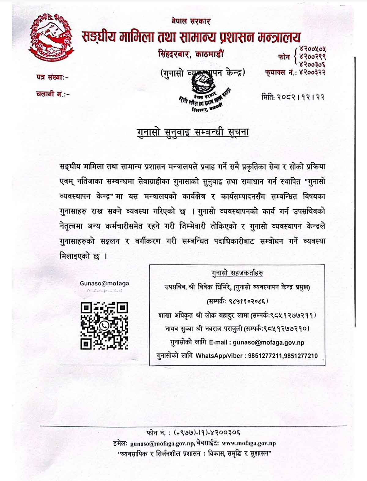 काठमाडौँ, चैत २३ गते । सङ्घीय मामिला तथा सामान्य प्रशासन मन्त्रालयले सेवा प्रवाहमा देखिएका समस्या, ढिलासुस्ती र नागरिक गुनासोलाई व्यवस्थित रूपमा सम्बोधन गर्न ‘गुनासो व्यवस्थापन केन्द्र’ स्थापना गरेको छ । मन्त्रालयले सार्वजनिक गरेको सूचनाअनुसार अब सेवाग्राहीले मन्त्रालयका काम–कारबाही, प्रक्रिया र नतिजासँग सम्बन्धित गुनासा सिधै राख्न सक्नेछन् ।