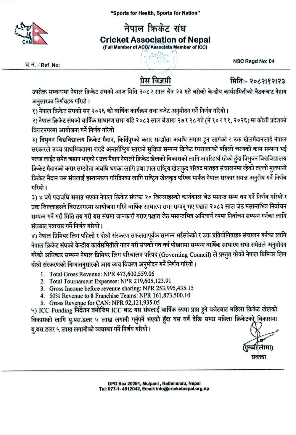 क्यानको सोमबार बसेको कार्यसमिति बैठकले एनपिएलको आम्दानी र खर्चको हिसाव पारित गरेको हो । वैठकमा क्यानको अधिकार सम्पन्न नेपाल प्रिमियर लिग परिचालन परिषद (गभर्निङ काउन्सील)ले हिसाब पेश गरेको थियो ।
