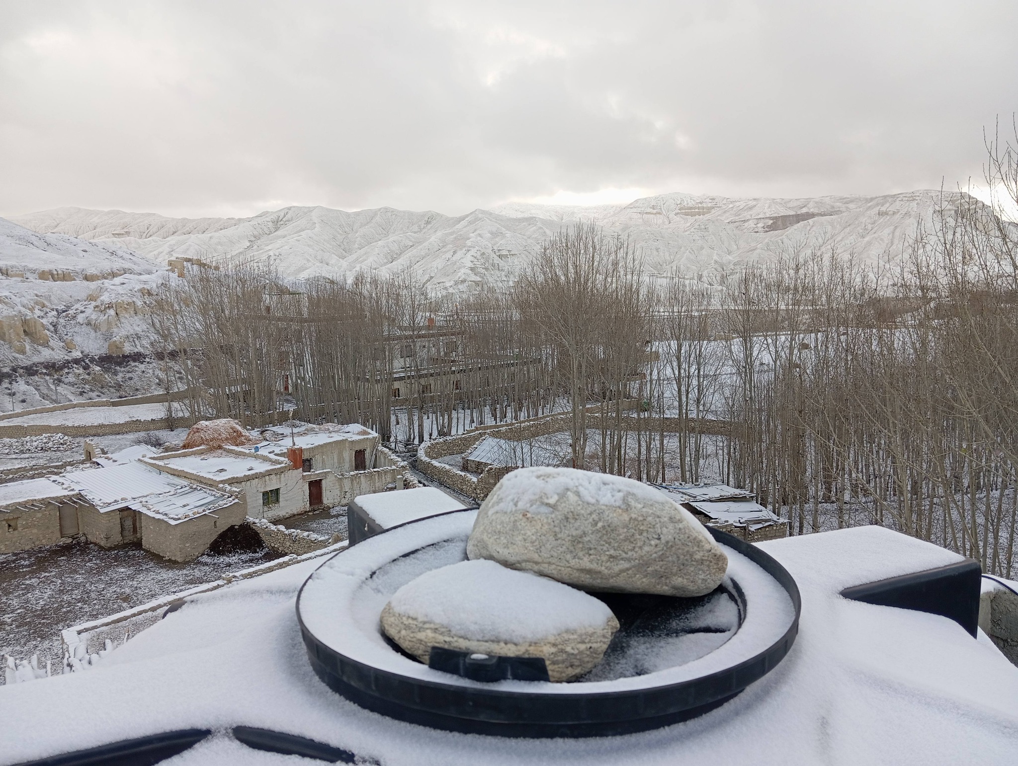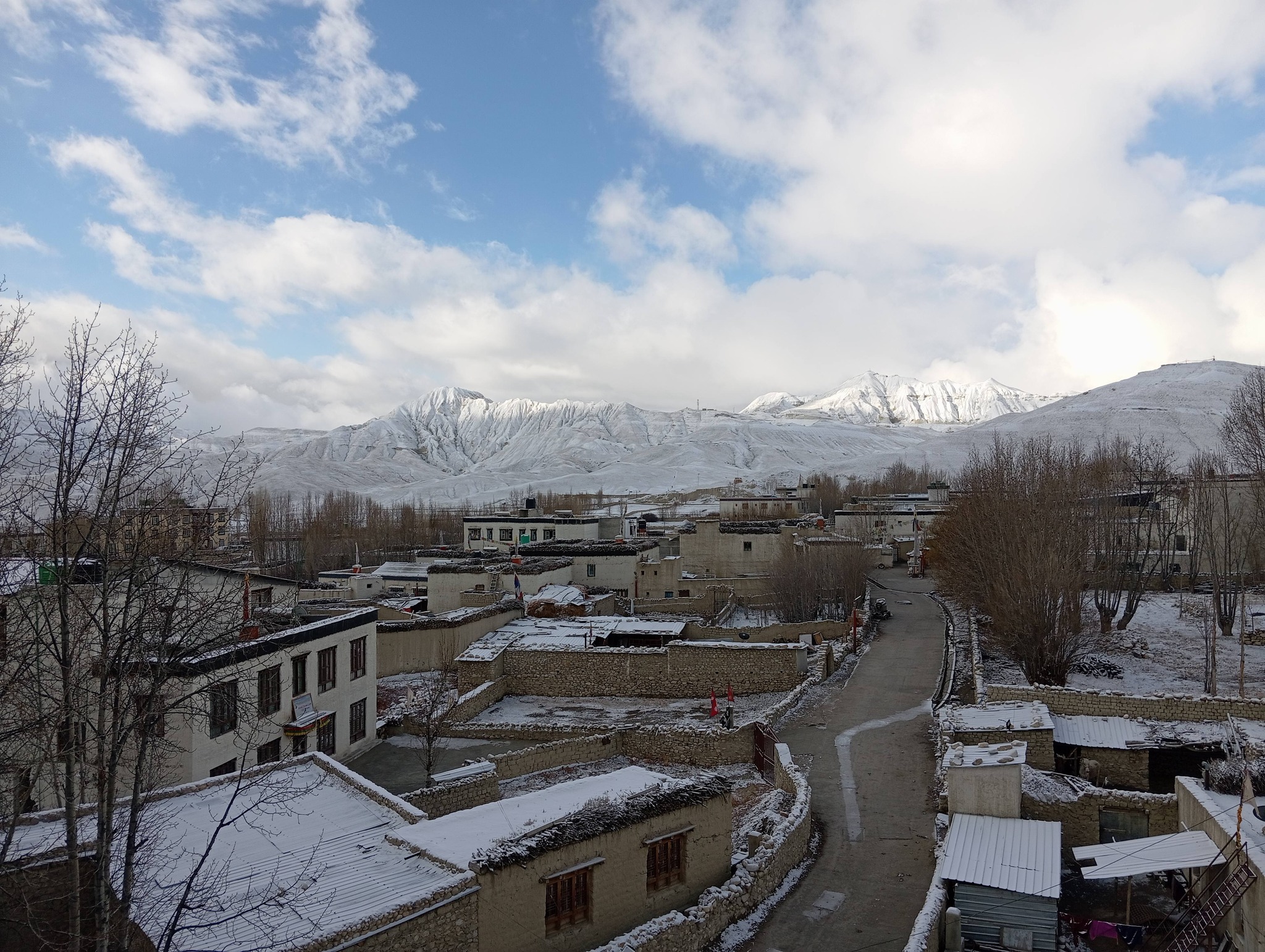 हिमपातपछि बिहीबार बिहान मौसम खुलेसँगै उपल्लो मुस्ताङको लोमान्थाङ बजारबाट देखिएको दृश्य। तस्बिर : हरिकृष्ण शर्मा