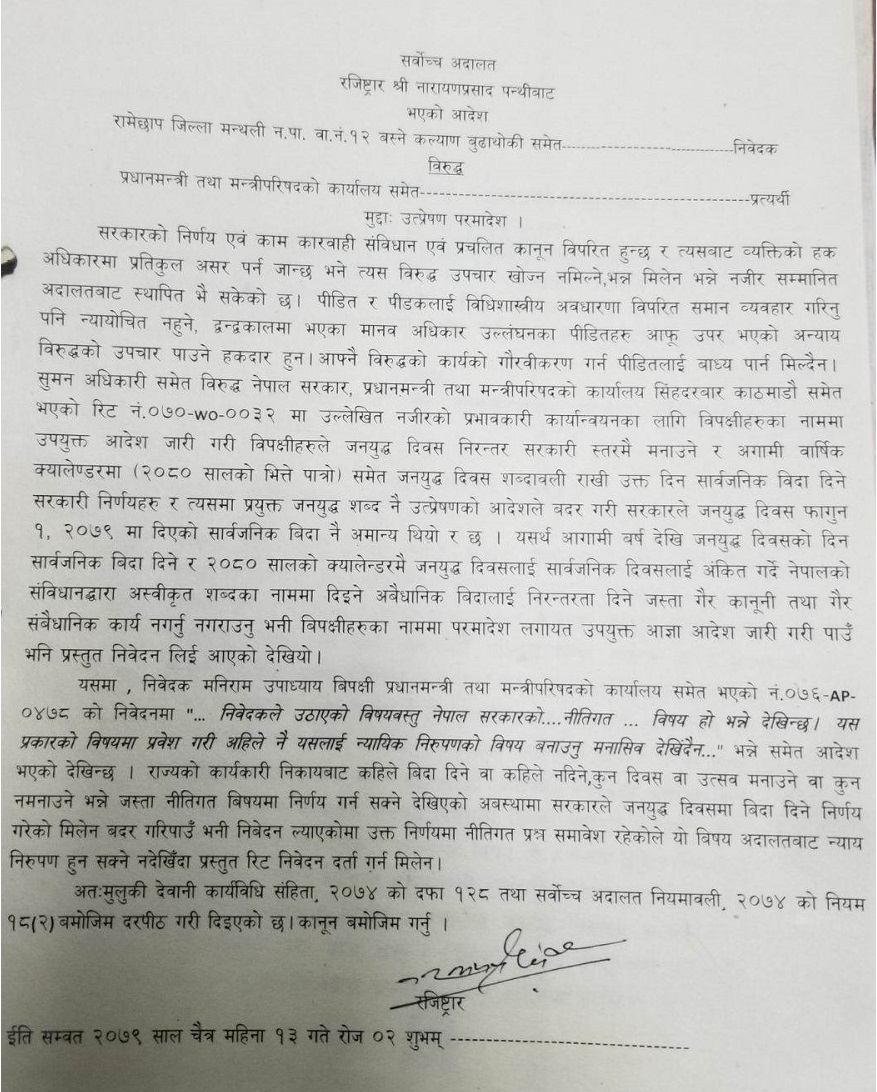सरकारले वार्षिक क्यालेन्डरमा जनयुद्ध दिवसलाई समावेश गरी सार्वजनिक बिदा दिने निर्णय गरेपछि प्रधानमन्त्री तथा मन्त्रिपरिषद्को कार्यालयविरुद्ध रामेछापका कल्याण बुढाथोकीले सर्वोच्चमा रिट निवेदन दिनुभएको थियो ।