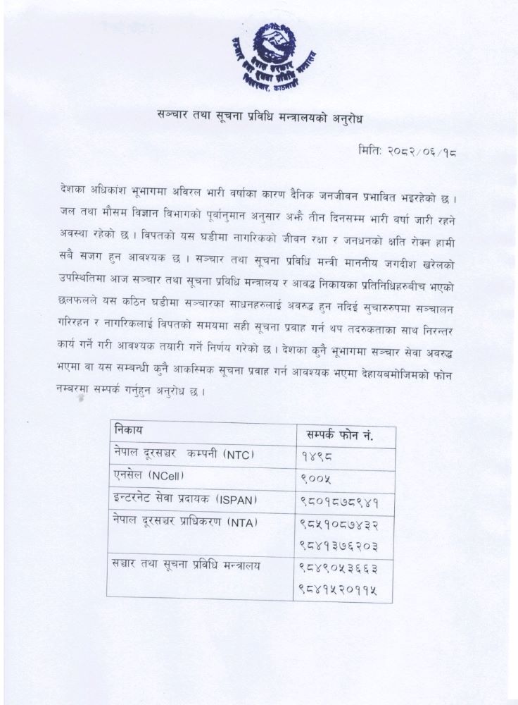 काठमाडौँ, असोज १८ गते । देशका अधिकांश भू–भागमा भइरहेको अविरल वर्षाका कारण जनजीवन प्रभावित भइरहेका बेला सञ्चार तथा सूचना प्रविधि मन्त्रालयले सूचना प्रवाहलाई निरन्तर र प्रभावकारी बनाउन सबै सञ्चार सेवाप्रदायक संस्थालाई अनुरोध गरेको छ।