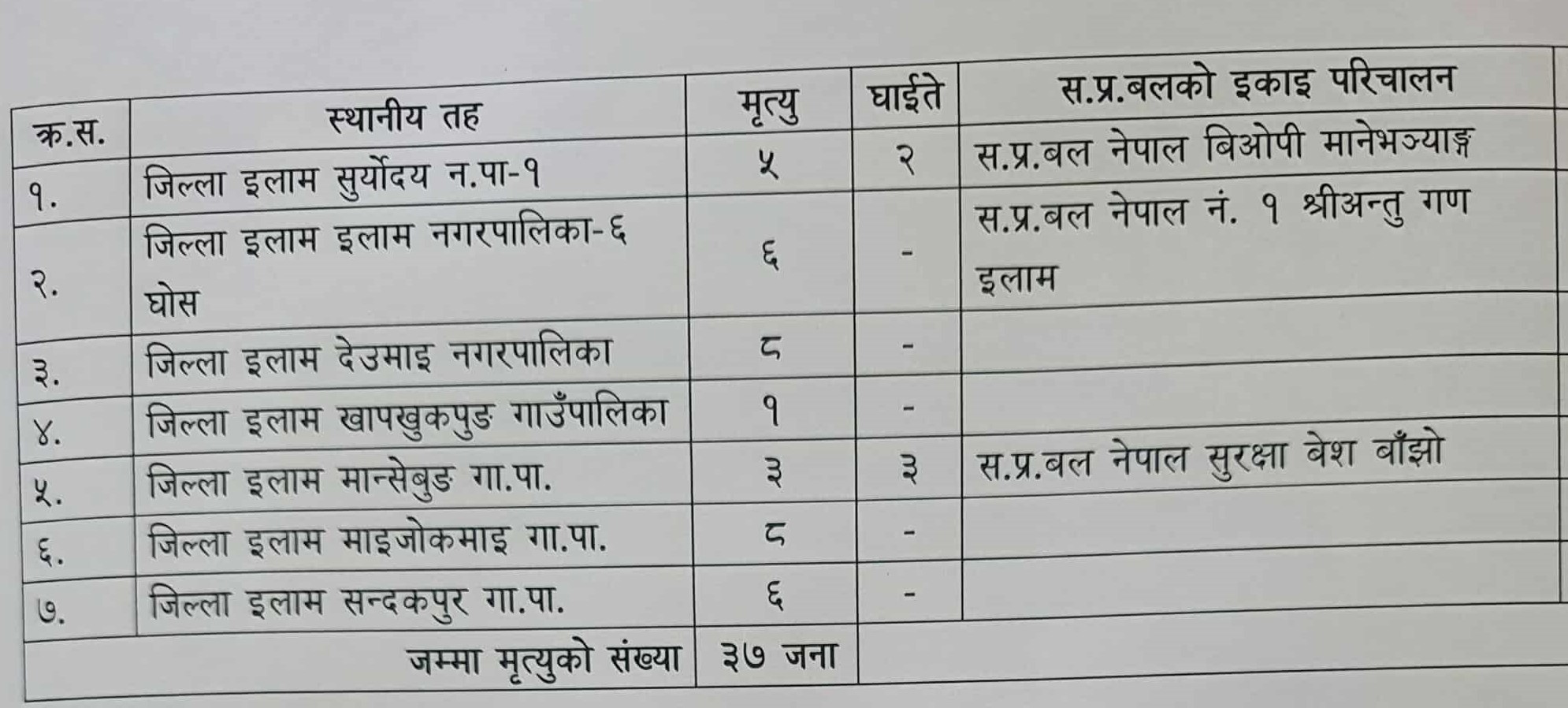 सूूर्योदय नगरपालिकामा ५ जना, इलाम नगरपालिका –६ मा ६ जना, सन्दकपुर गाउँपालिकामा ६ जना, माङ्सेबुुङमा ३ जना, देउमाई नगरपालिकामा ८ जना, माइजोगमाईमा ८ जना र फाकफोकथुममा १ गरी ३७ जनाको ज्यान गएको इलामका प्रमुख जिल्लाअधिकारी सुनिता नेपालले जानकारी दिनुुभयो ।