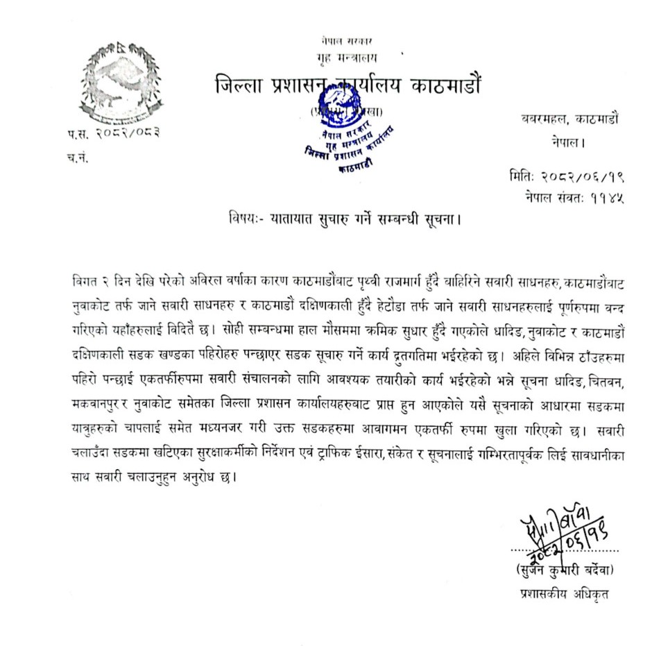 जिल्ला प्रशासन कार्यालय काठमाडौंकी प्रशासकीय अधिकृत सुजनकुमारी बर्देवाले मौसममा क्रमिक सुधार हुँदै गएपछि सडकमा यात्रुको चापलाई दृष्टिगत गर्दै उक्त सडकमा आवागमन एकतर्फी रुपमा खुला गर्ने निर्णय गरेको जानकारी दिनुभयो ।