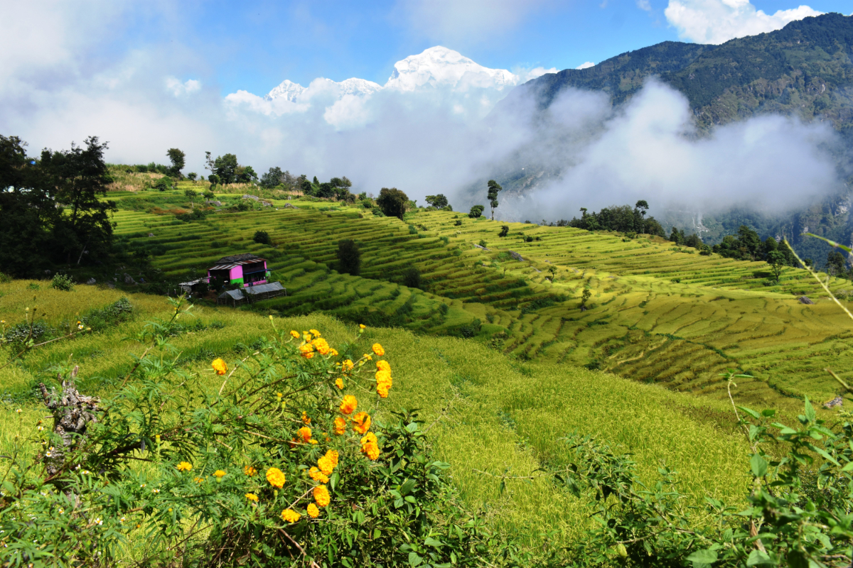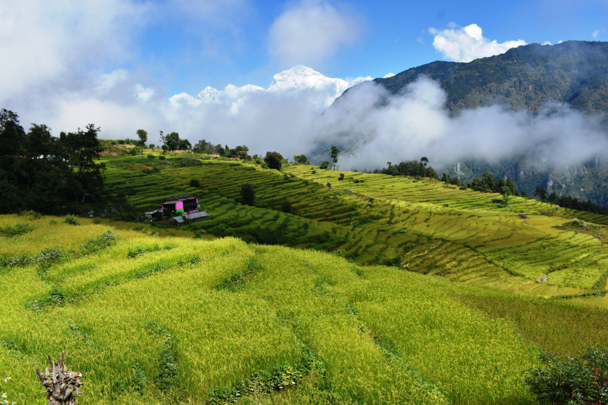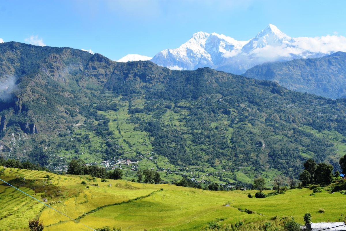 म्याग्दी, असोज १९ गते । म्याग्दीको बेनी नगरपालिका ९ तोरीपानी स्थित फाँटमा धानको बाला झुलेको हरियाली र पृष्ठभूमिमा देखिएको धौलागिरि हिमालको सुन्दर दृश्य।