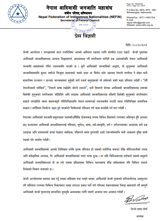 उहाँले विज्ञप्तिमा लेख्नुभएको छ, “आदिबासीको आफ्नो बिशिष्टता भनेकै पृथक पहिचान हो । जसको शारीरिक बनावटदेखि बोलीचाली अनि सांस्कृतिक अभ्यास गैर आदिबासीको भन्दा फरक हुन्छ । यही विविधतालाई स्वीकार्न नसक्ने समूहले आदिबासीलाई यो वा त्यो नाममा विभेदको शिकार बनाउँदै आएको छ ।”