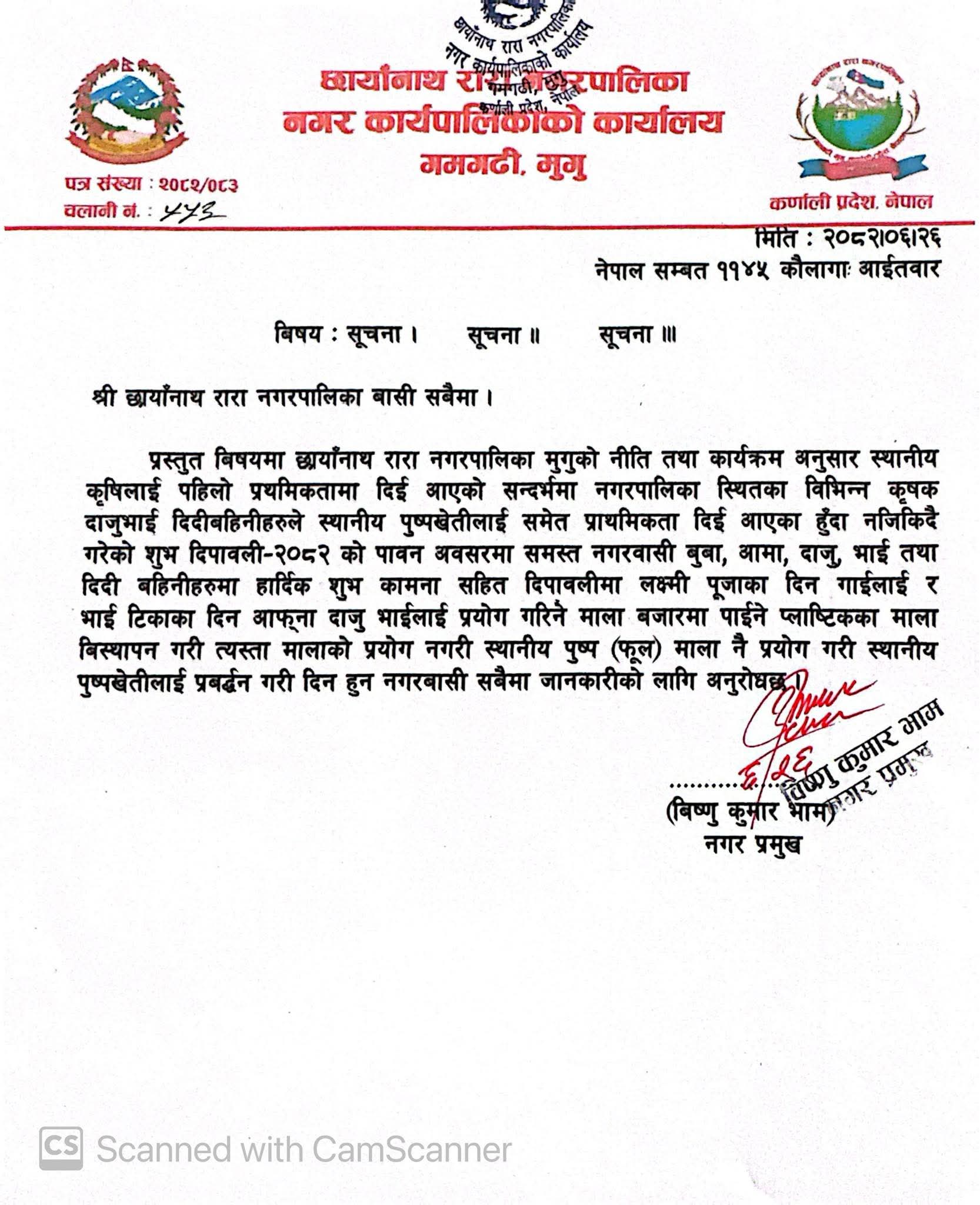 मुगु, असोज २७ गते । मुगुको छायानाथरारा नगरपालिकाले नगरक्षेत्रभित्र रहेका कृषक तथा व्यवसायीलाई प्लास्टिकजन्य माला र कृत्रिम फूल सजावट सामग्री बिक्री नगर्न अनुरोध गरेको छ ।