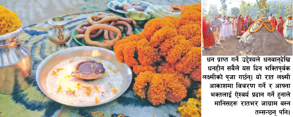 लक्ष्मीपूजाको प्रसङ्गमा यस दिन बेलुका अष्टलक्ष्मीको पूजा गरिन्छ । लक्ष्मीलाई धनकी देवी मानिन्छ । समुद्रकी छोरी, विष्णुकी शक्ति लक्ष्मीलाई प्रसन्न पार्न यो रात दीपावली गर्ने तथा जुवा पनि खेल्ने चलन छ । यस दिन लक्ष्मीका अतिरिक्त अष्टसिद्धि, कुवेर, इन्द्र, ऐरावत तथा चन्द्रमाको पनि पूजा गरिन्छ । चन्द्रमा लक्ष्मीका सहोदर भाइ भएकाले लक्ष्मीलाई खुसी पार्न चन्द्रमालाई पनि खुसी पार्नुपर्ने मान्यता छ ।