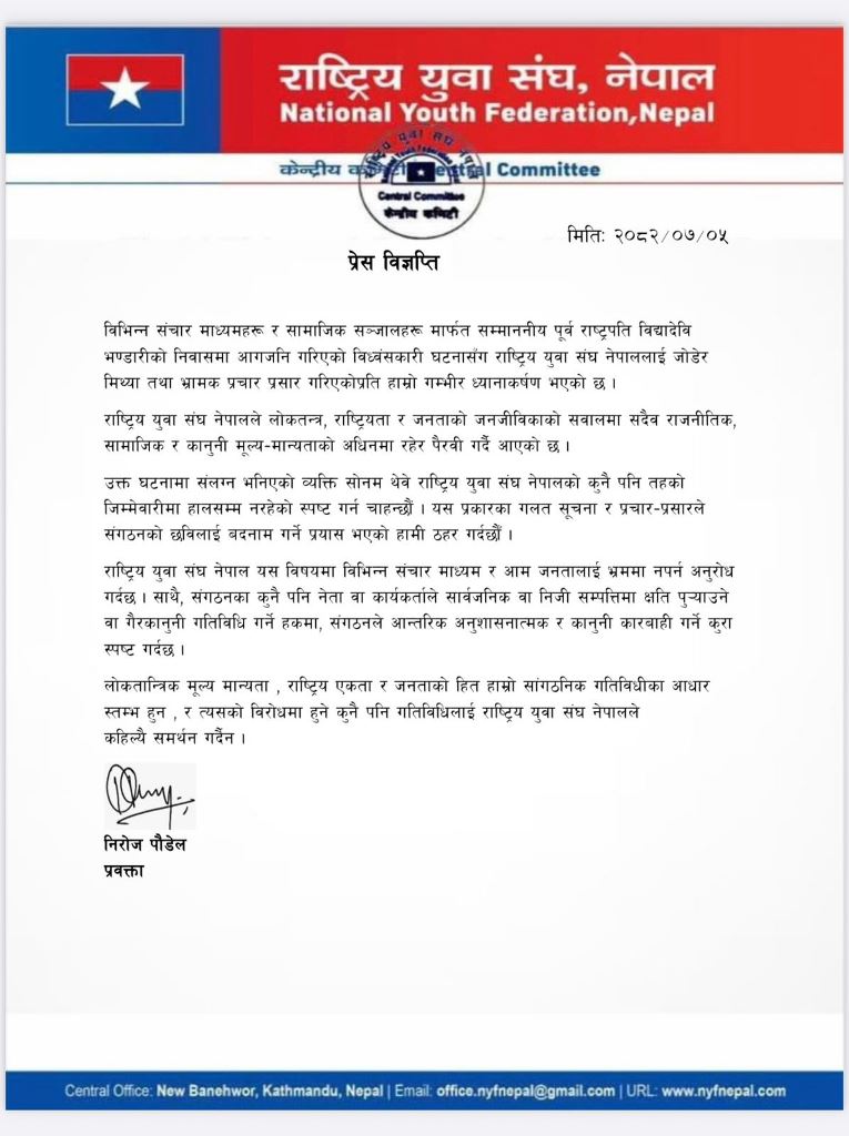 विज्ञप्तिमा भनिएको छ, "विभिन्न सञ्चार माध्यमहरू र सामाजिक सञ्जालहरूमार्फत सम्माननीय पूर्व राष्ट्रपति विद्यादेवि भण्डारीको निवासमा आगजनि गरिएको विध्वंसकारी घटनासँग राष्ट्रिय युवा संघ नेपाललाई जोडेर मिथ्या तथा भ्रामक प्रचारप्रसार गरिएकोप्रति हाम्रो गम्भीर ध्यानाकर्षण भएको छ ।"