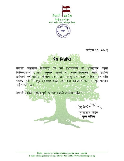 काठमाडौँ, कात्तिक ११ गते । नेपाली कांग्रेसका सभापति शेरबहादुर देउवा थप उपचारका लागि सिंगापुर प्रस्थान गर्नुभएको छ । जेनजी आन्दोलनबाट गम्भीर घाइते हुनुभएका देउवा पत्नि आरजु राणा देउवासहित थप उपचारका सोमबार राति ११ः०५बजे सिंगापुर एयरलाइन्समार्फत त्यसतर्फ प्रस्थान गर्नुभएको हो ।