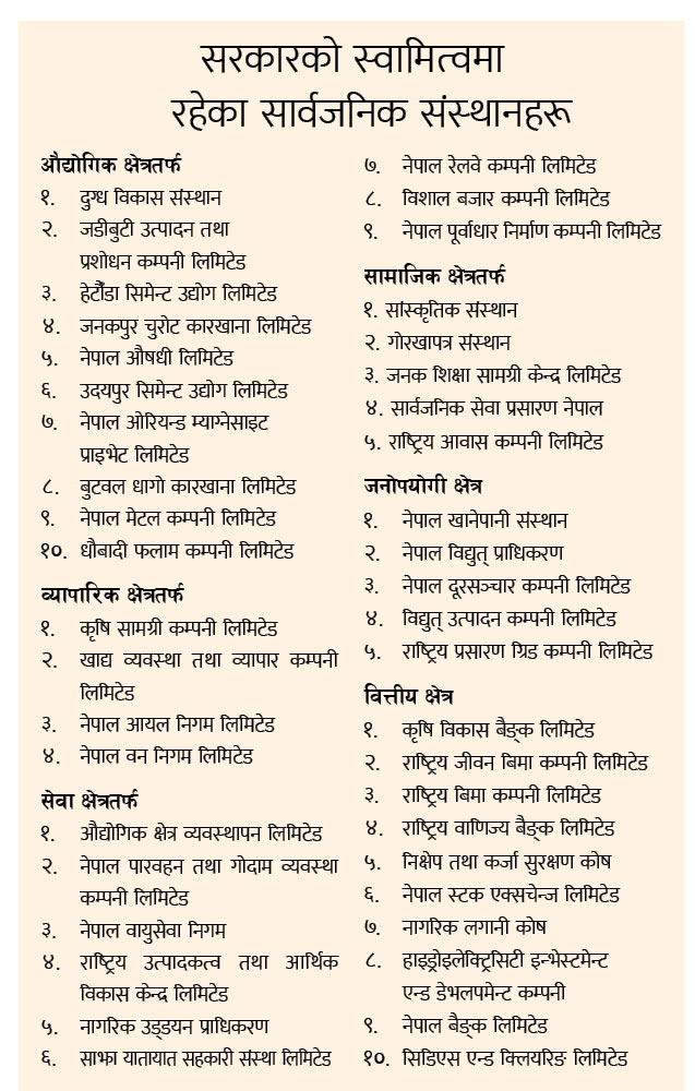 अहिले कायम रहेका सार्वजनिक संस्थानमध्ये ३४ वटा कम्पनी ऐन अनुसार स्थापित भए पनि आठ वटा विशेष ऐन अन्तर्गत, एउटा सञ्चार संस्थान ऐन अनुसार, एउटा सहकारी ऐन अनुसार र एउटा संस्थान ऐन अनुसार सञ्चालनमा छन् । कम्पनी ऐनभन्दा अलग कानुनबाट सञ्चालन भइरहेका संस्थानलाई पनि सरकारले सोही ऐन अन्तर्गत सञ्चालन गर्ने नीति अघि सारेको हो ।