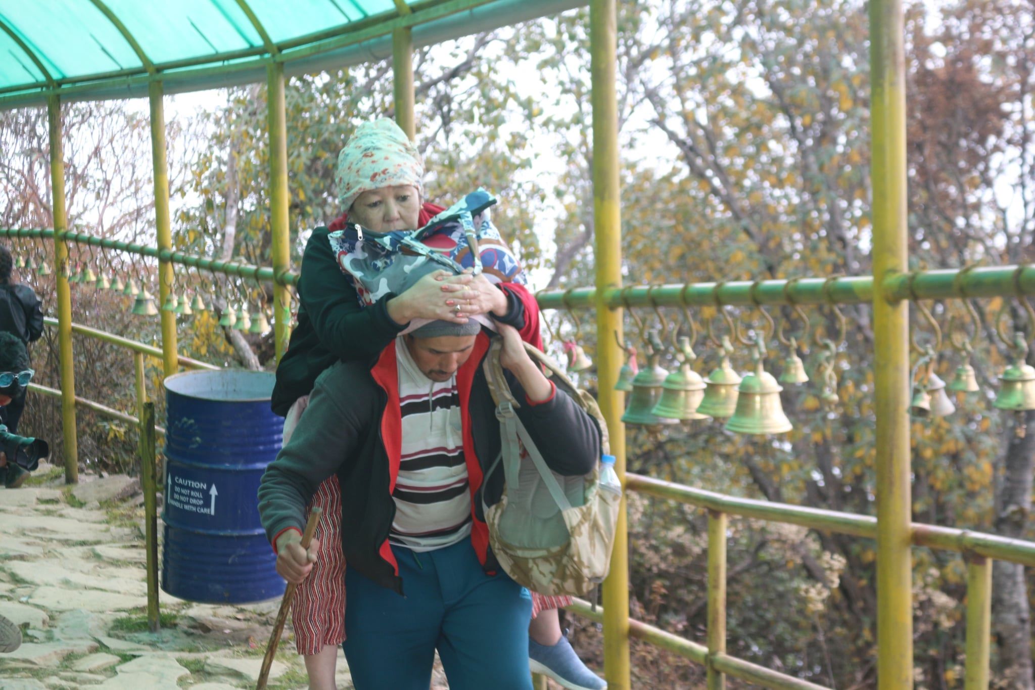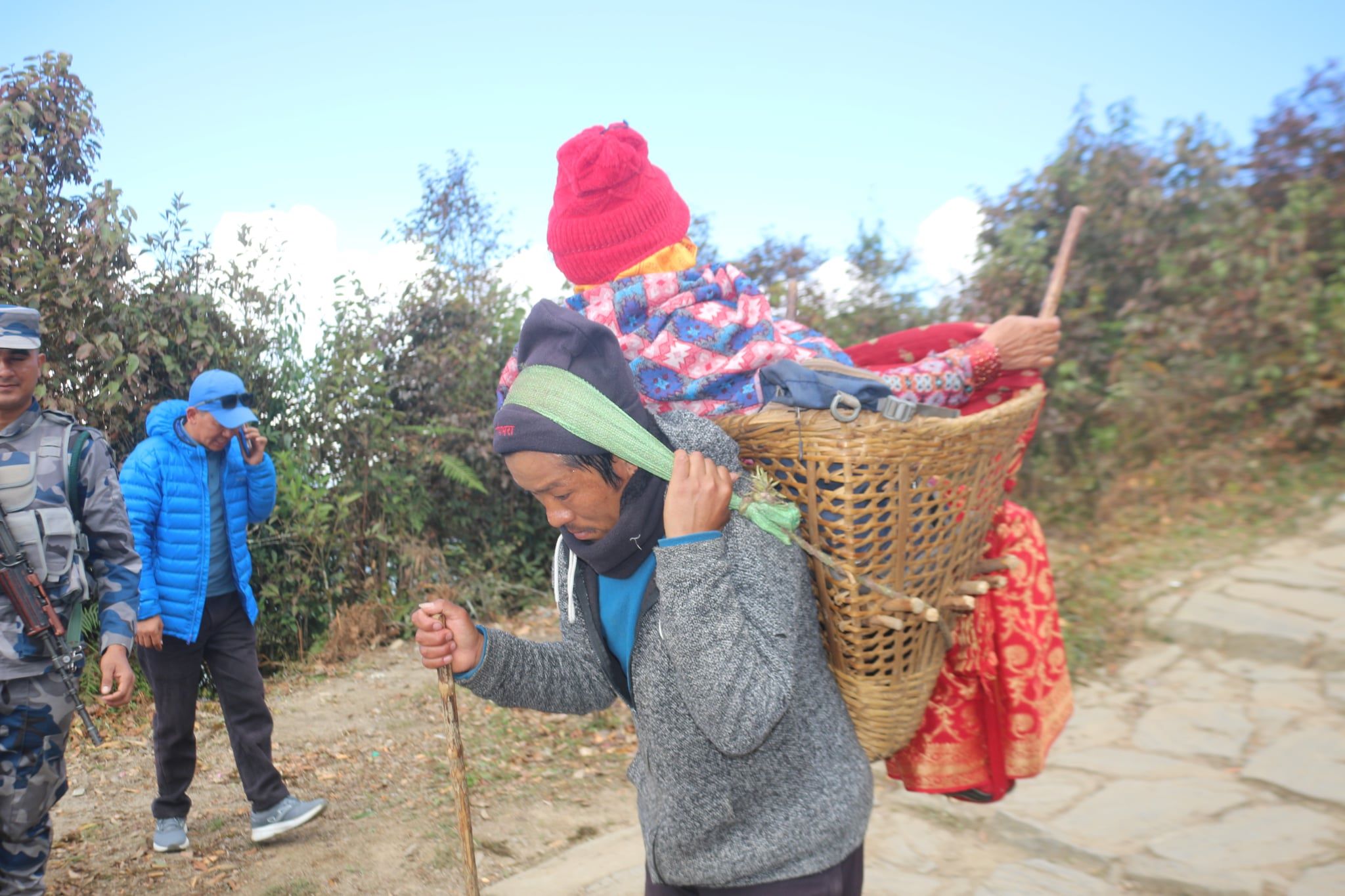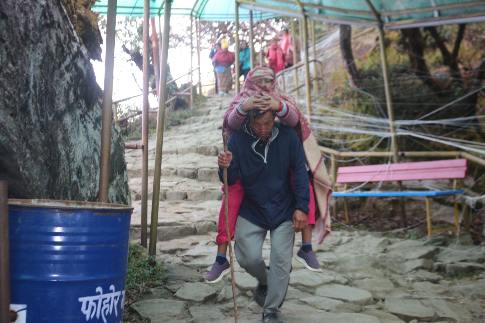 बोकेर पाथीभराको दर्शन गराउन लगिदै भरिया । तस्बिरः साहारा लिम्बू