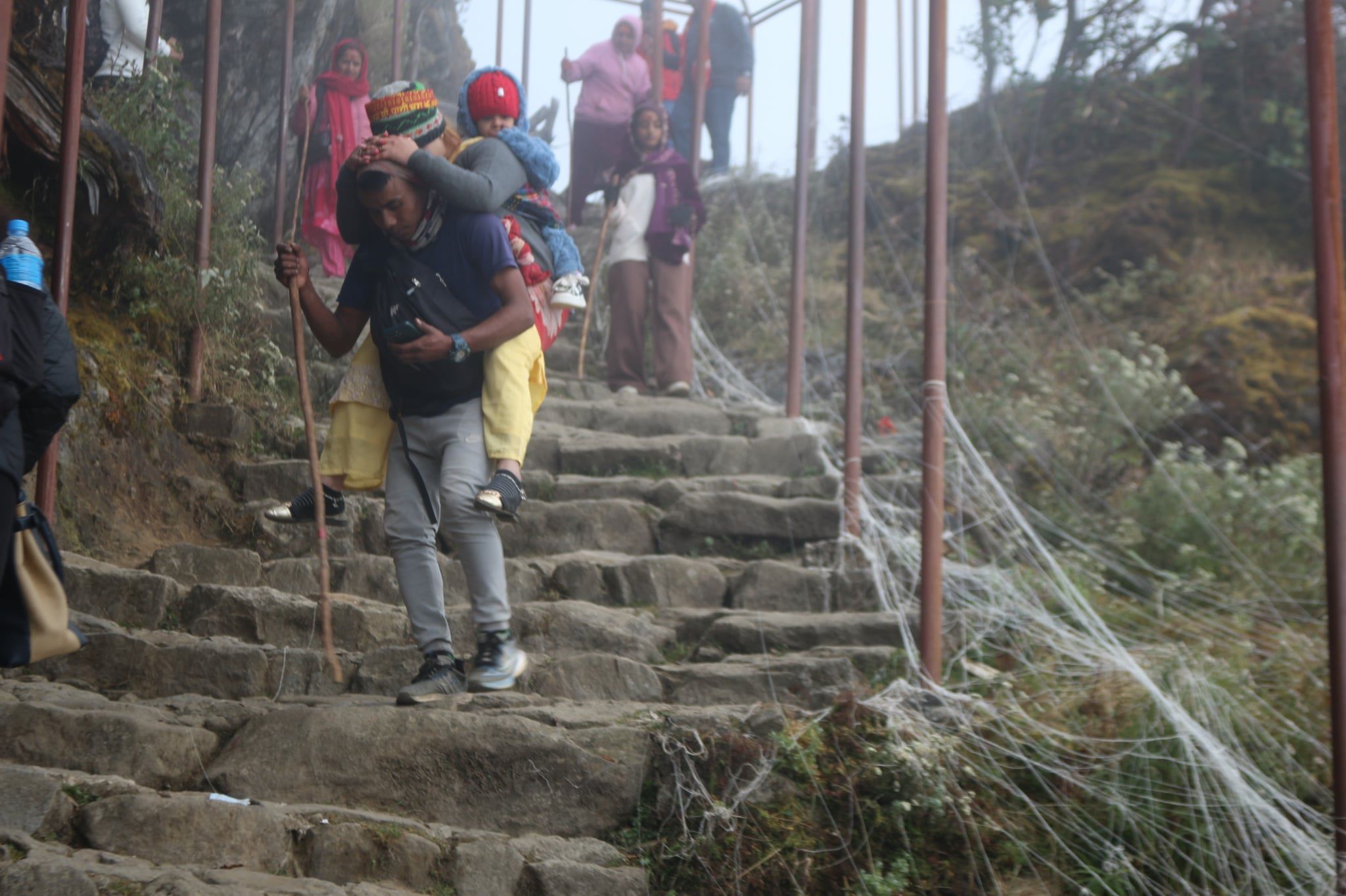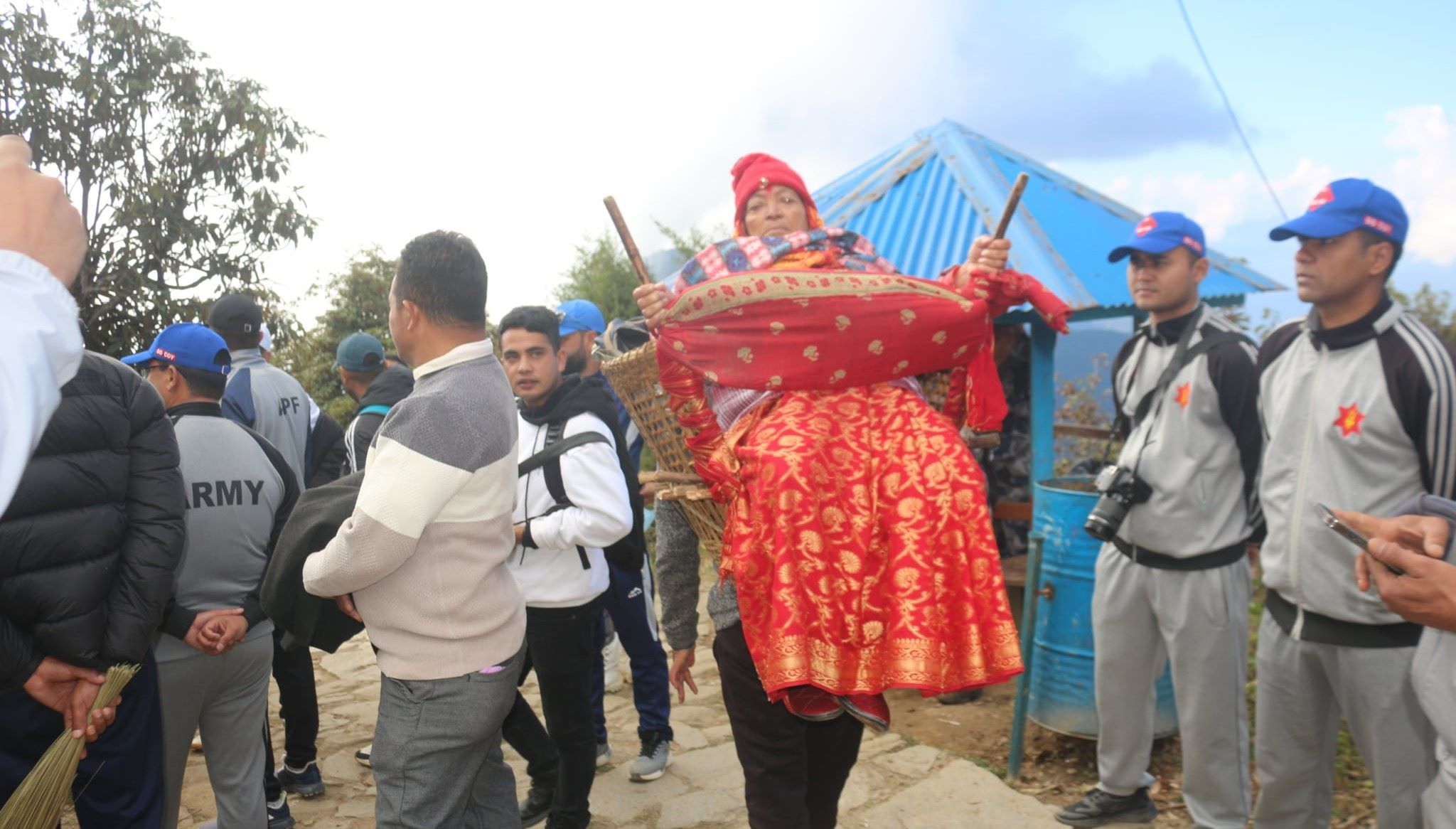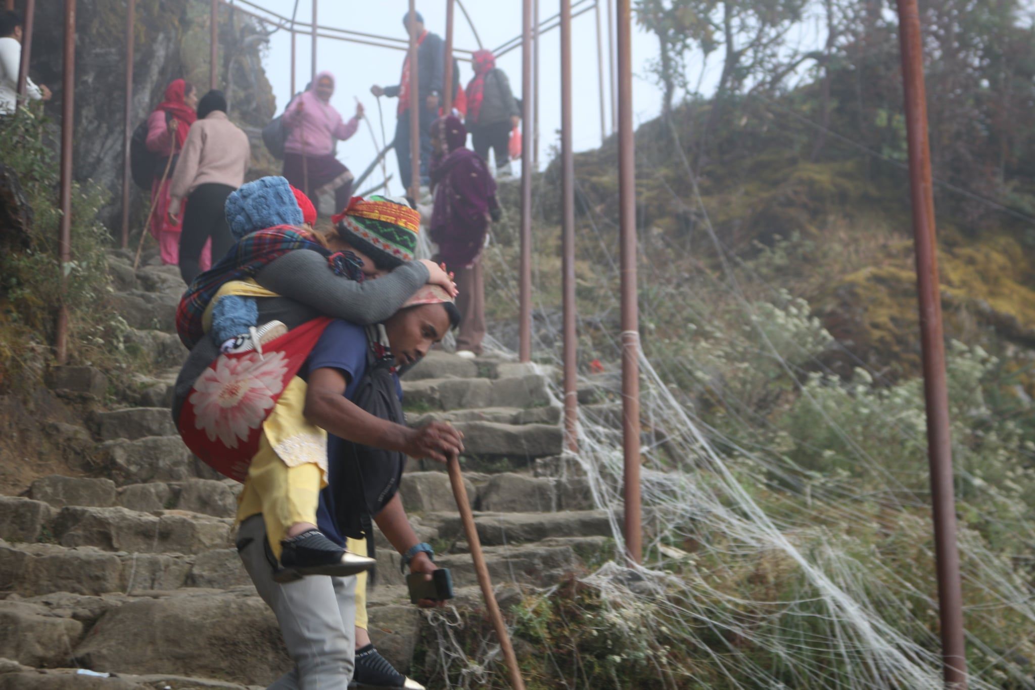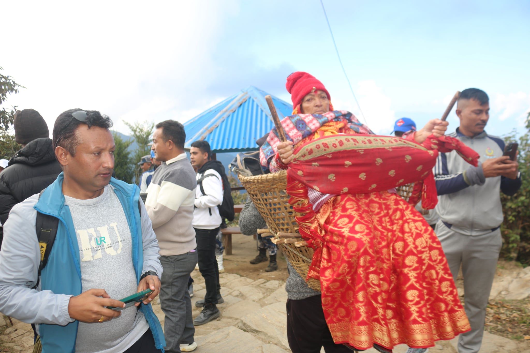 बोकेर पाथीभराको दर्शन गराउन लगिदै भरिया । तस्बिरः साहारा लिम्बू