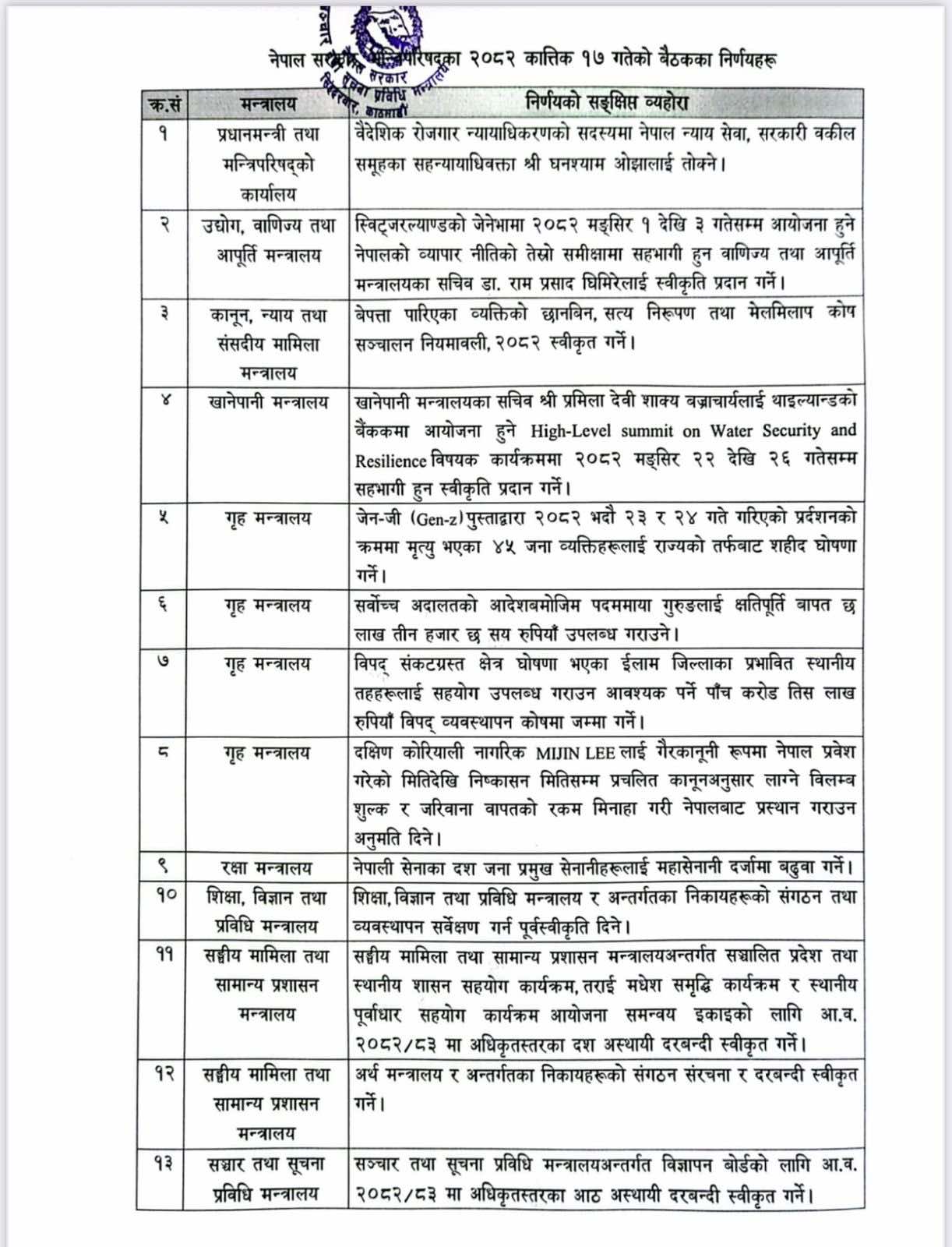 मन्त्रिपरिषद् बैठकका १३ निर्णयः